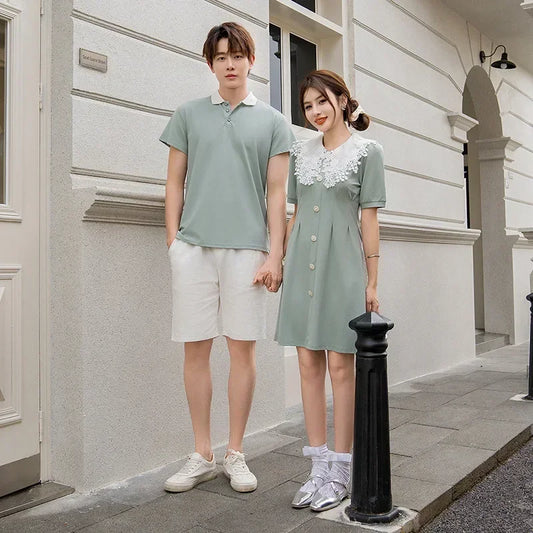 ملابس 2024 لجميع أفراد الأسرة فساتين بياقة للأم والابنة مجموعات قمصان متطابقة للأب والابن ملابس متطابقة للزوجين في الصيف