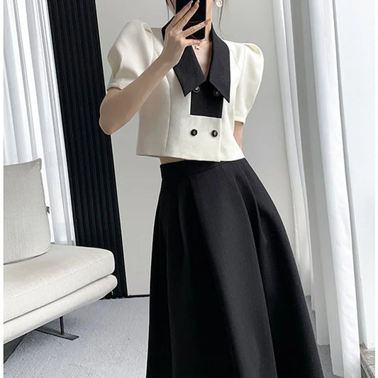 طقم مكون من قطعتين أنيقين فرنسيين، بلوزة قصيرة بيضاء بأكمام منفوخة، تنورة ميدي سوداء بقصة A، طقم ملابس صيفي عتيق