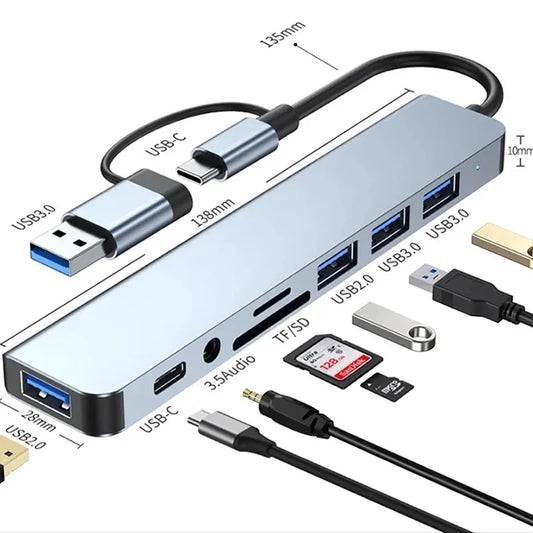 موزع USB C، موزع USB، 8 في 1، موسع USB مع 4 منافذ USB، منفذ USBC واحد، قارئ بطاقات TF/SD، مخرج صوت متوافق مع MacBook