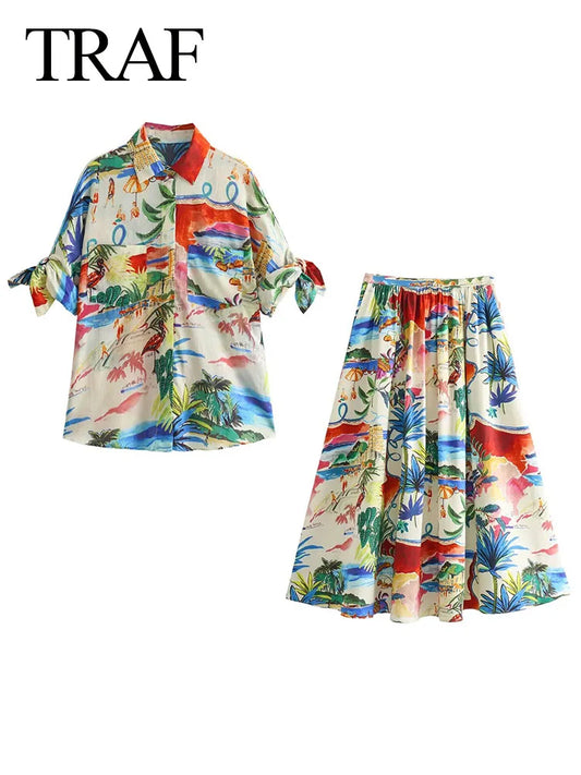 طقم تنورة مكون من قطعتين مطبوع عليه شعار صيفي غير رسمي من TRAF 2024 للنساء مع جيوب وقميص بصف واحد من الأزرار وتنورة رفيعة مطوية بسحاب وجيوب