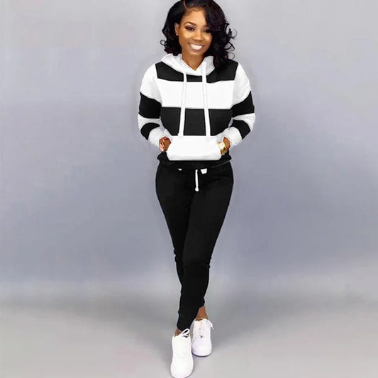 Women's horizontal striped sportswear two-piece long sleeved full zippered hoodie and pants sportswear set slim fit sportswear