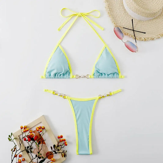 Women Bikini Set Contrast Color Halter Neck Three-point Pearl Deep V Neck Swimming Suit Bathers Women Micro Thong Bikinis