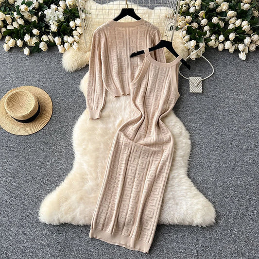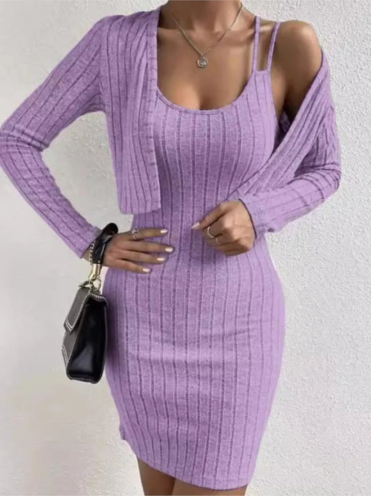Fashion Women Slim Mini Dress 2 Piece Sets Autumn Ribbed Double Strap Bodycon Sleeveless Vest Dress + Long Sleeve Cardigan Set