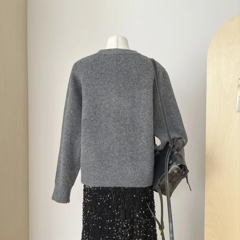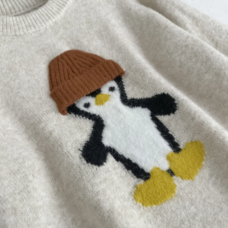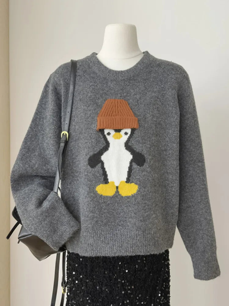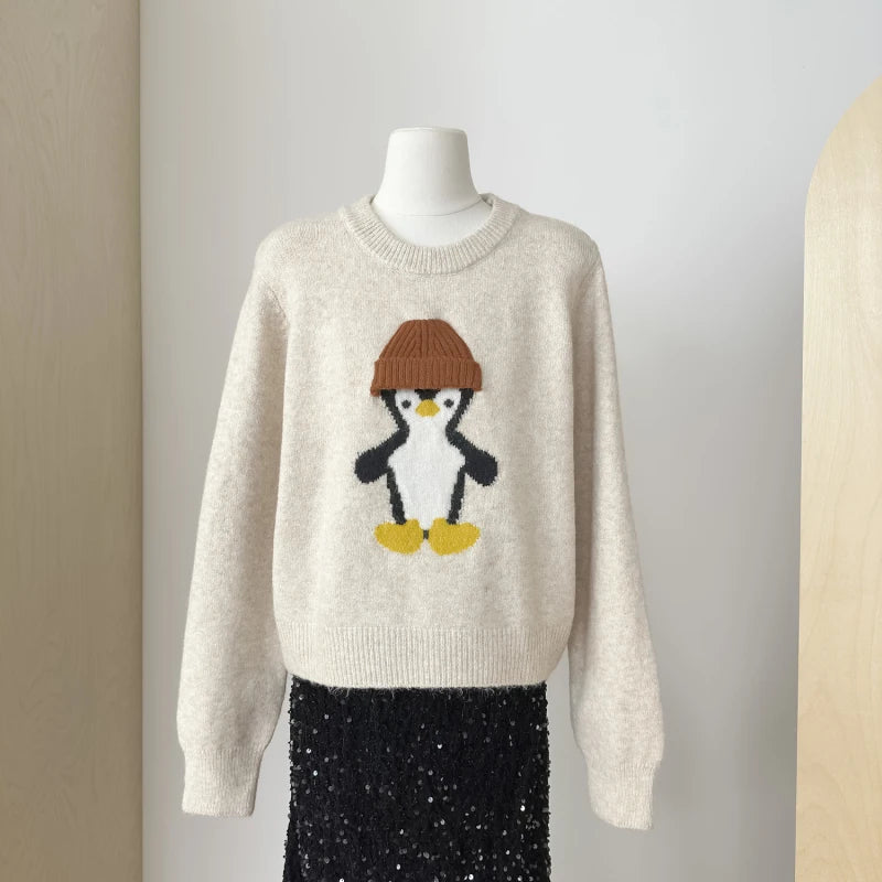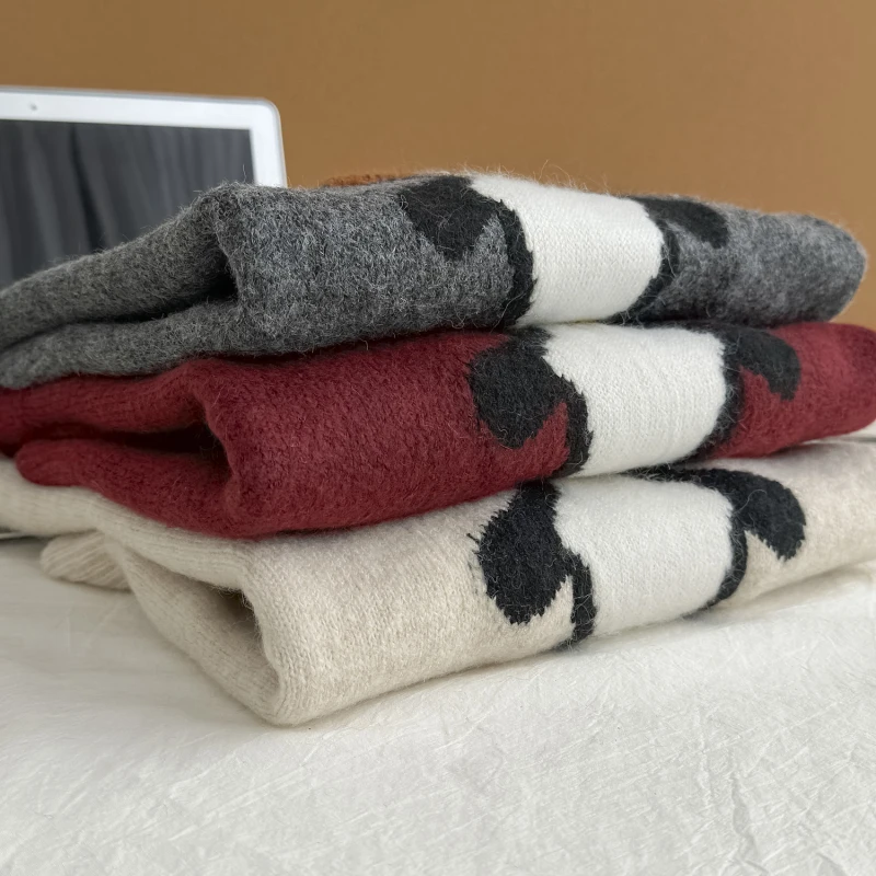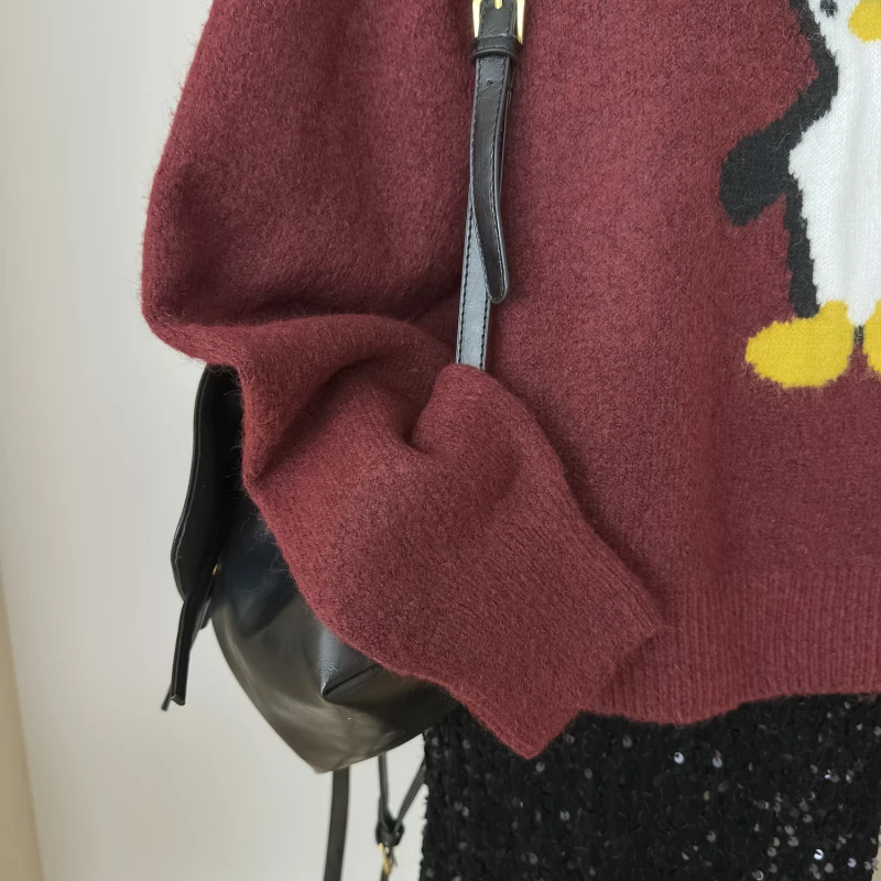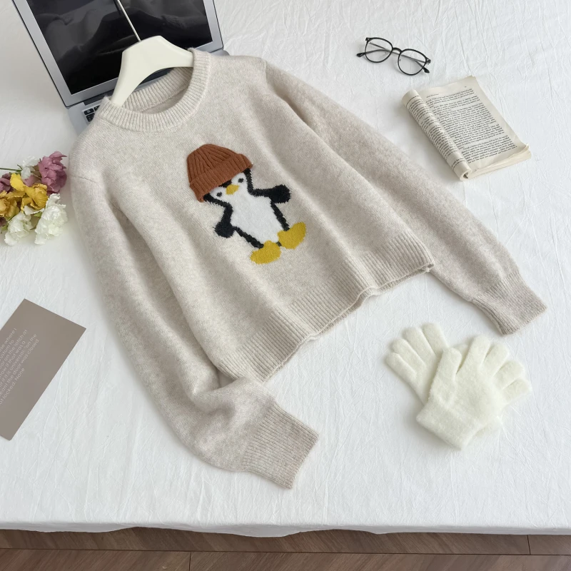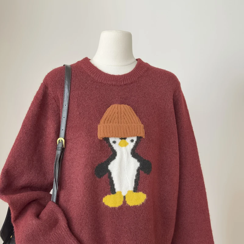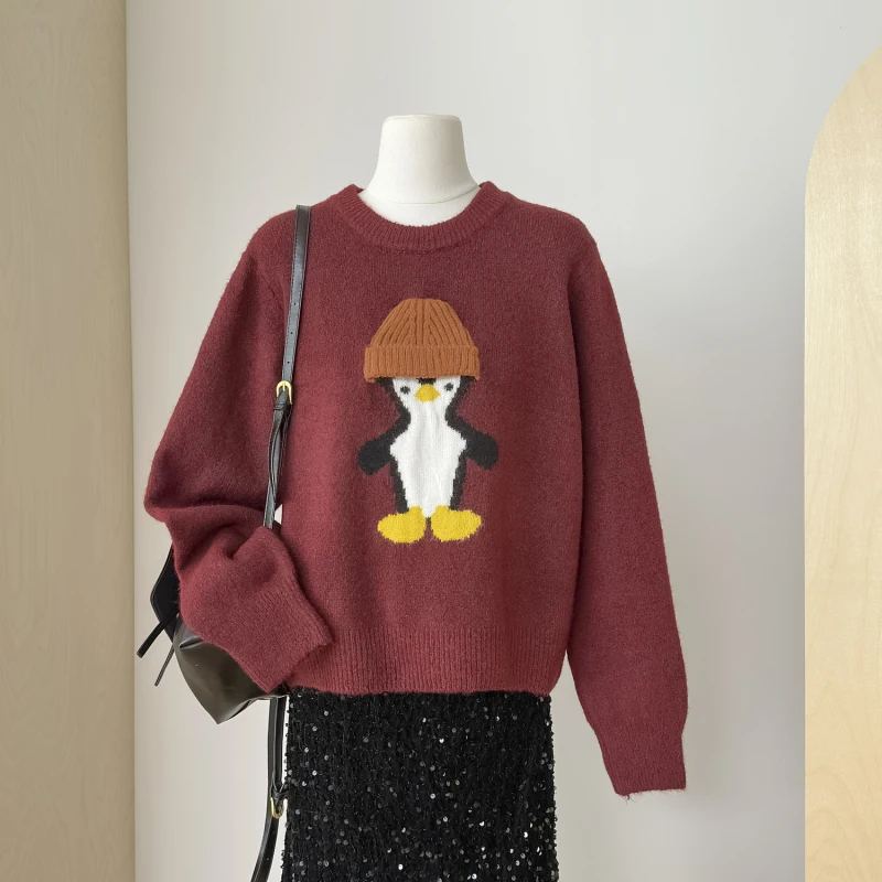 سترة نسائية فضفاضة جديدة لخريف وشتاء 2024 عالية الجودة كورية أنيقة لطيفة على شكل قبعة البطريق سترة محبوكة من الجاكار