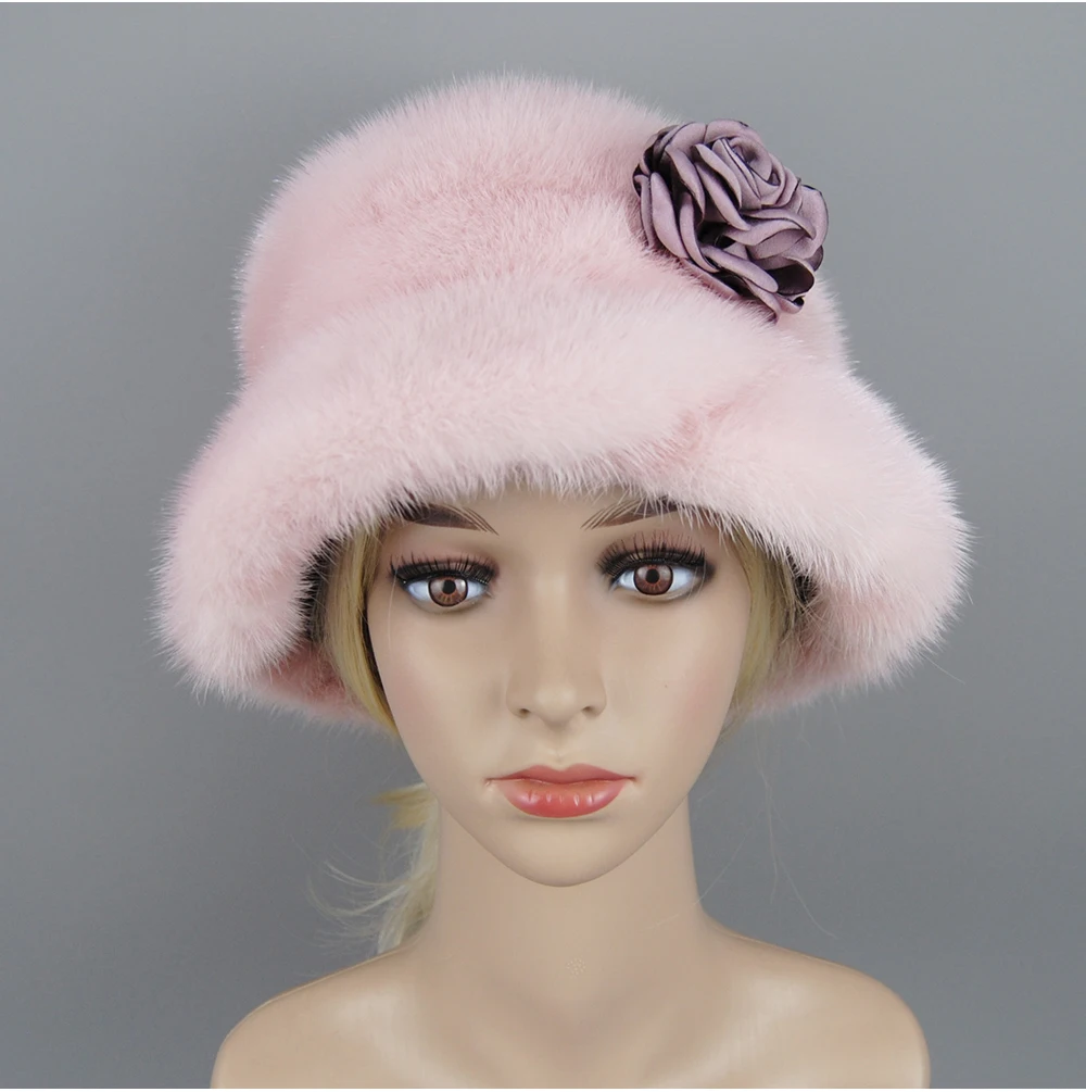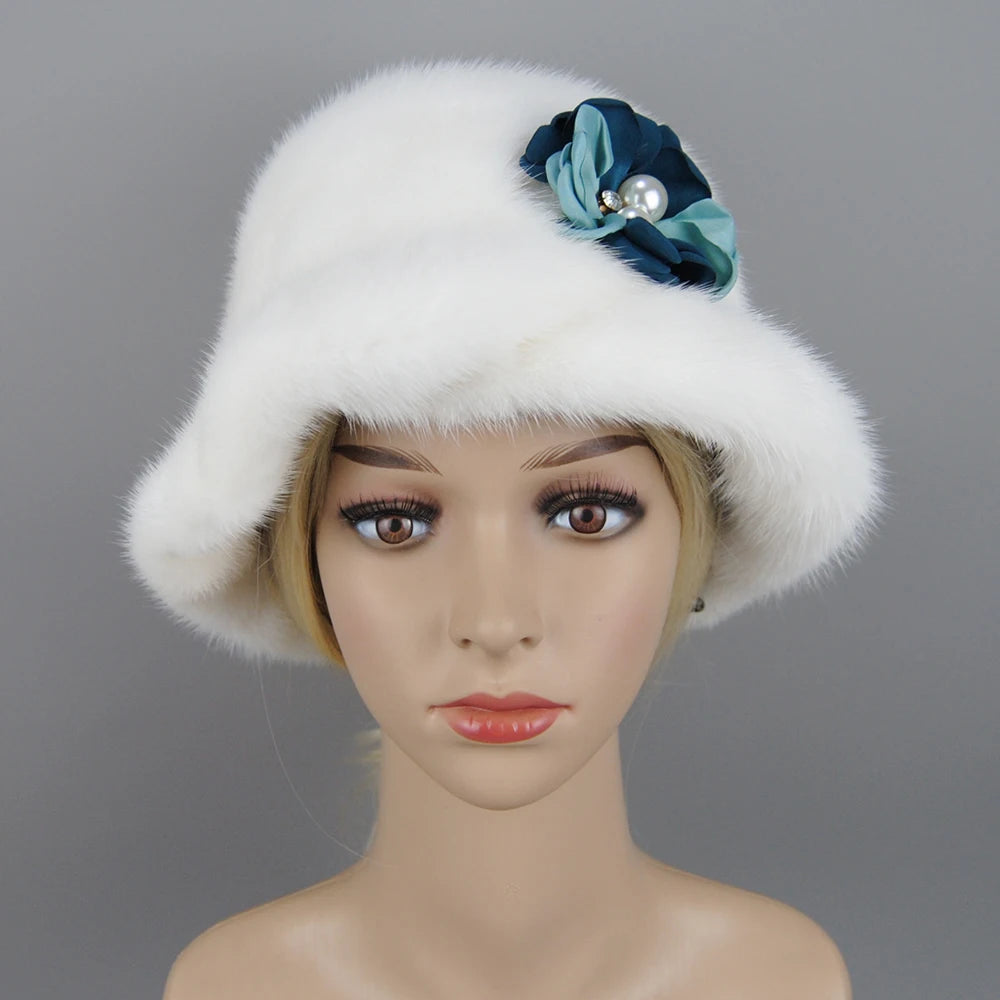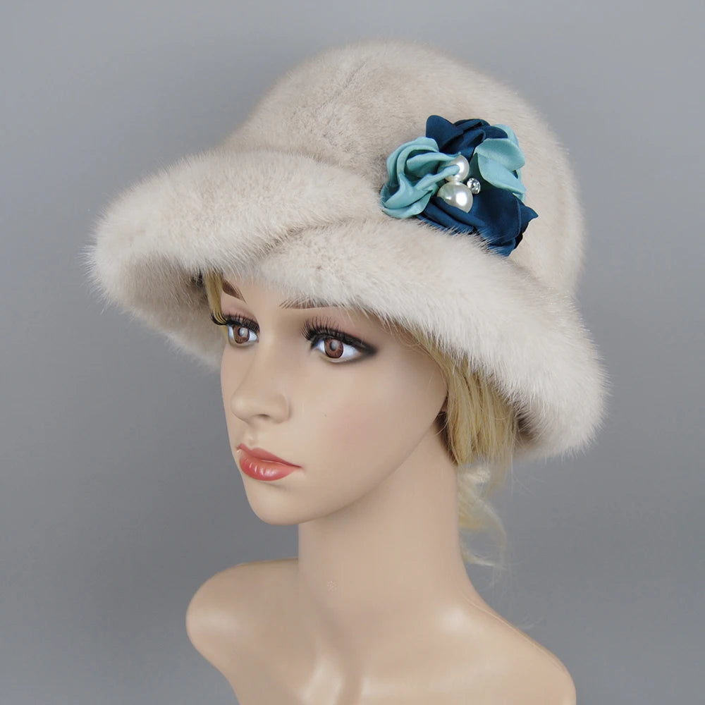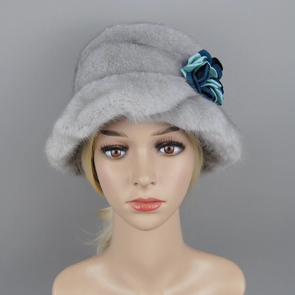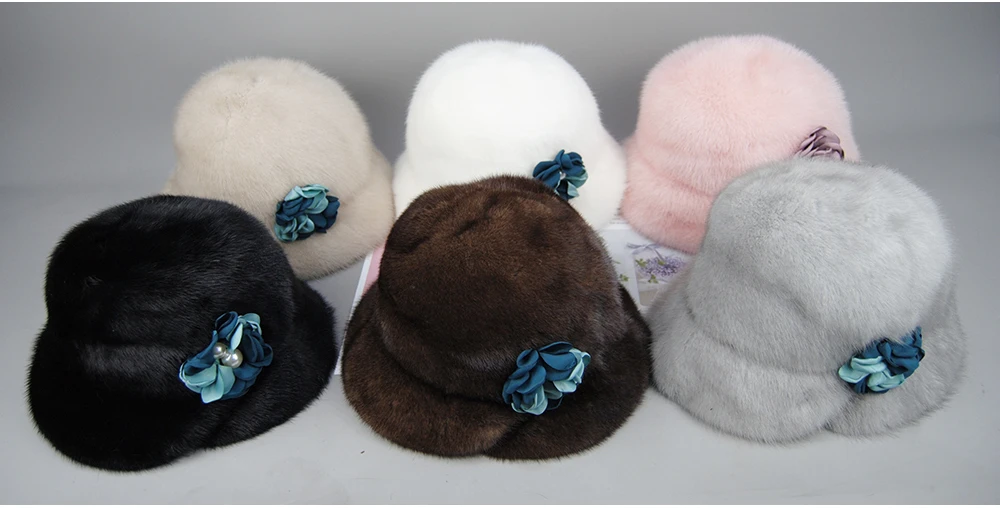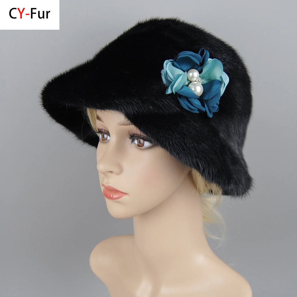 قبعات نسائية شتوية دافئة لعام 2024 من فرو المنك الصلب مع زهور وقبعات من فرو المنك الطبيعي قبعات دلو من الفرو الحقيقي محبوكة ناعمة للفتيات الروسيات
