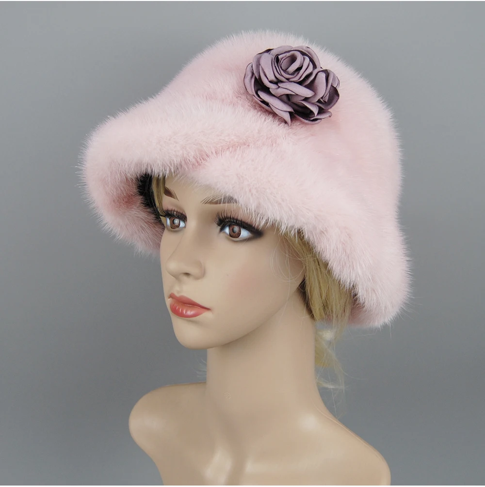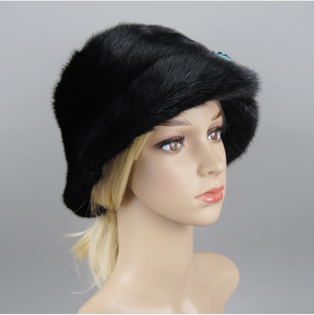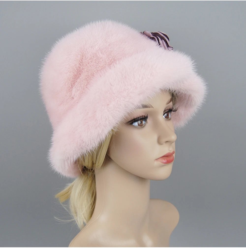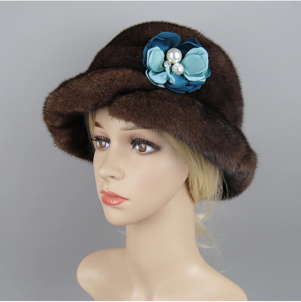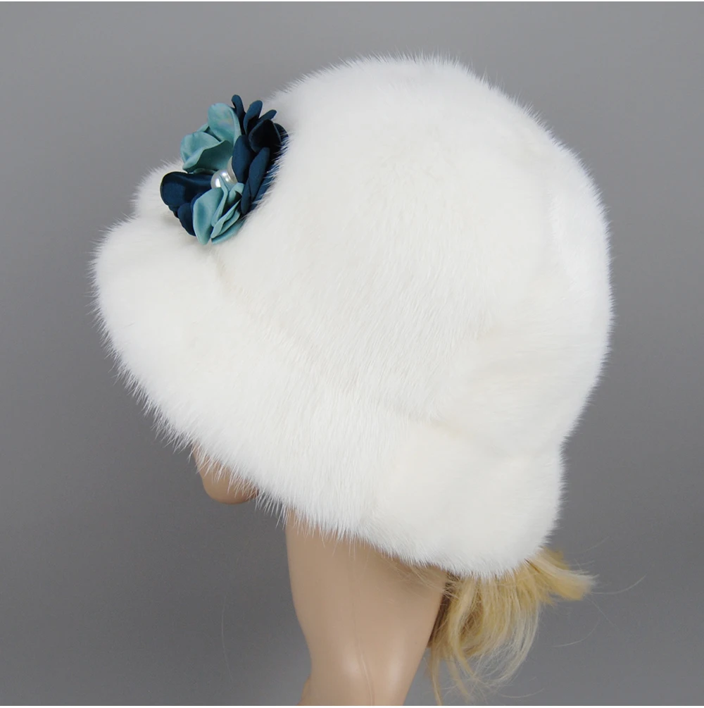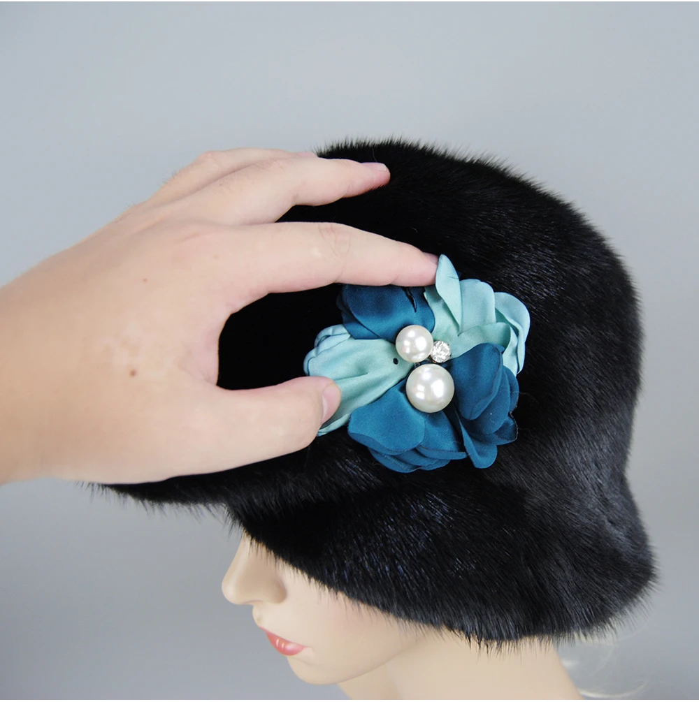 قبعات نسائية شتوية دافئة لعام 2024 من فرو المنك الصلب مع زهور وقبعات من فرو المنك الطبيعي قبعات دلو من الفرو الحقيقي محبوكة ناعمة للفتيات الروسيات
