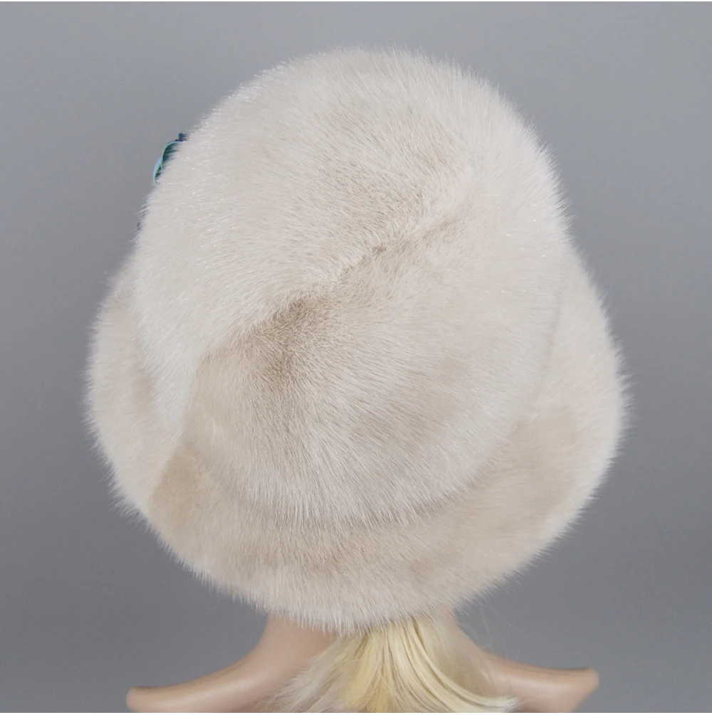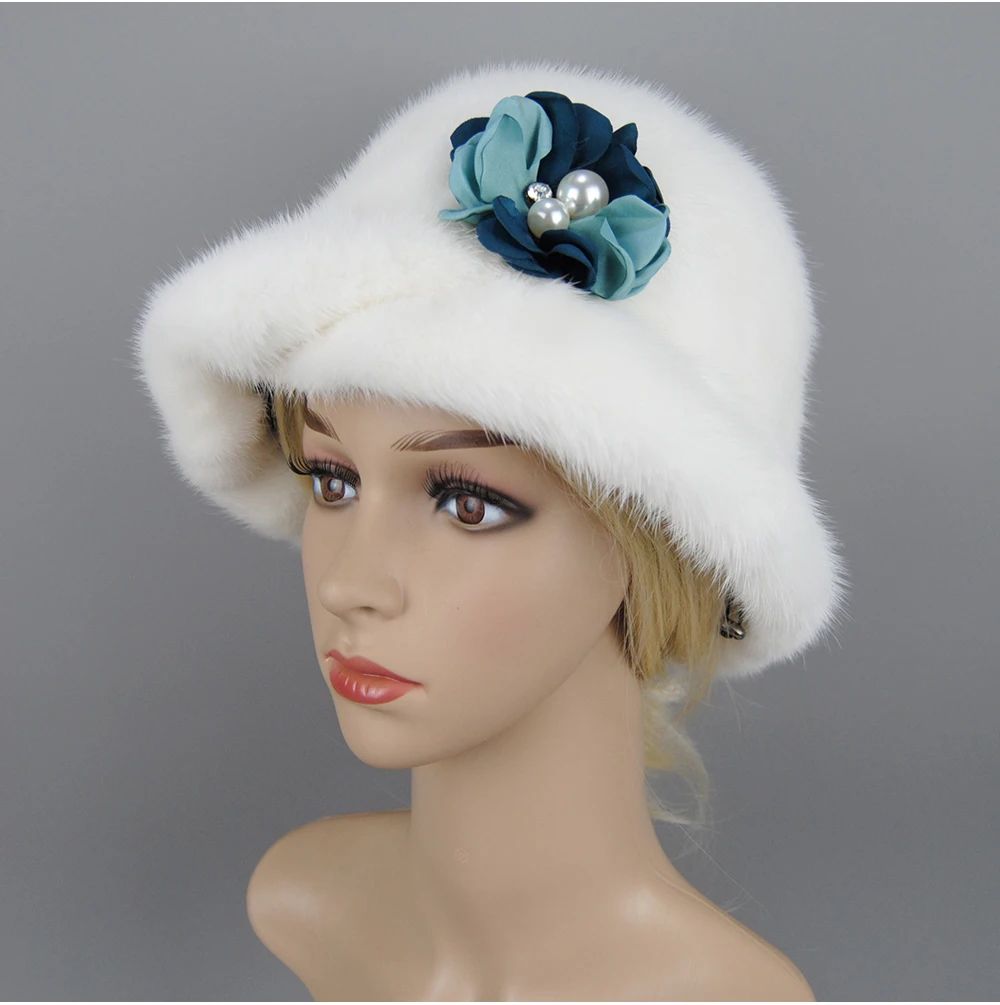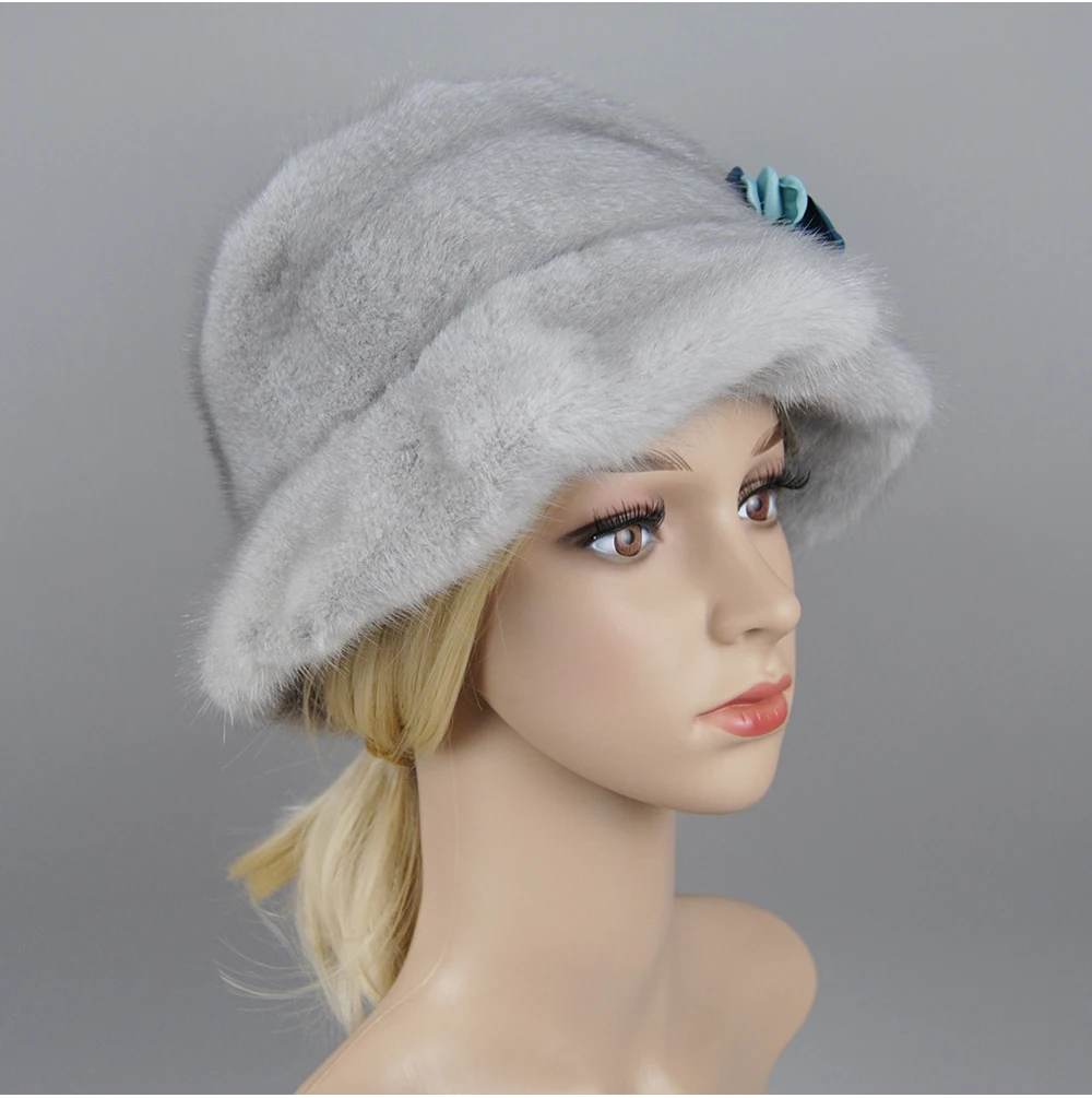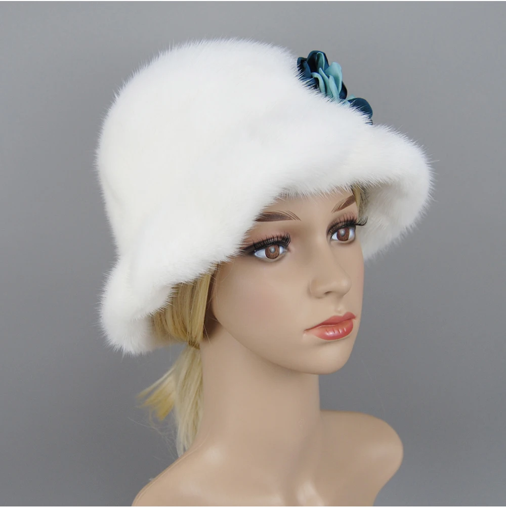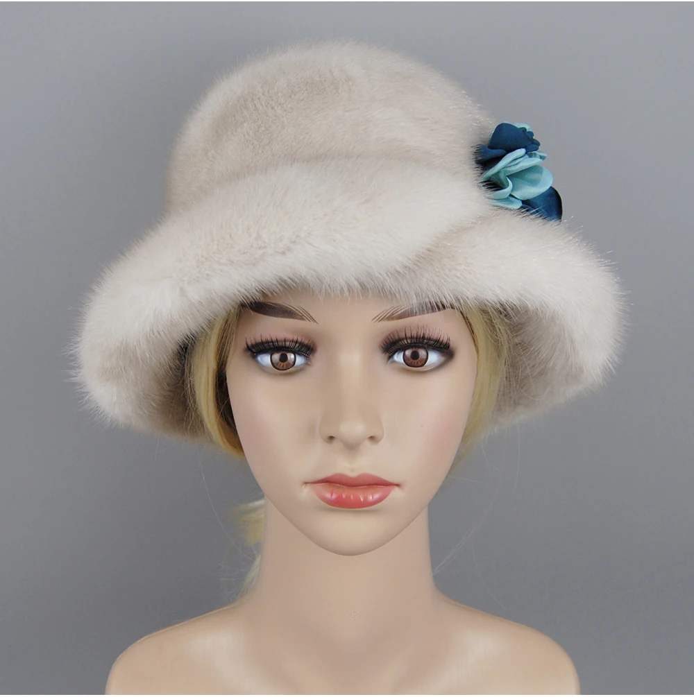 قبعات نسائية شتوية دافئة لعام 2024 من فرو المنك الصلب مع زهور وقبعات من فرو المنك الطبيعي قبعات دلو من الفرو الحقيقي محبوكة ناعمة للفتيات الروسيات