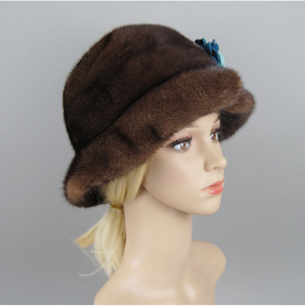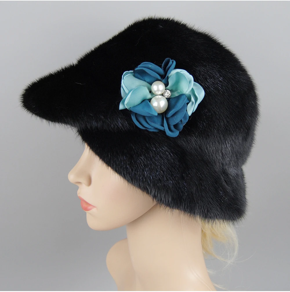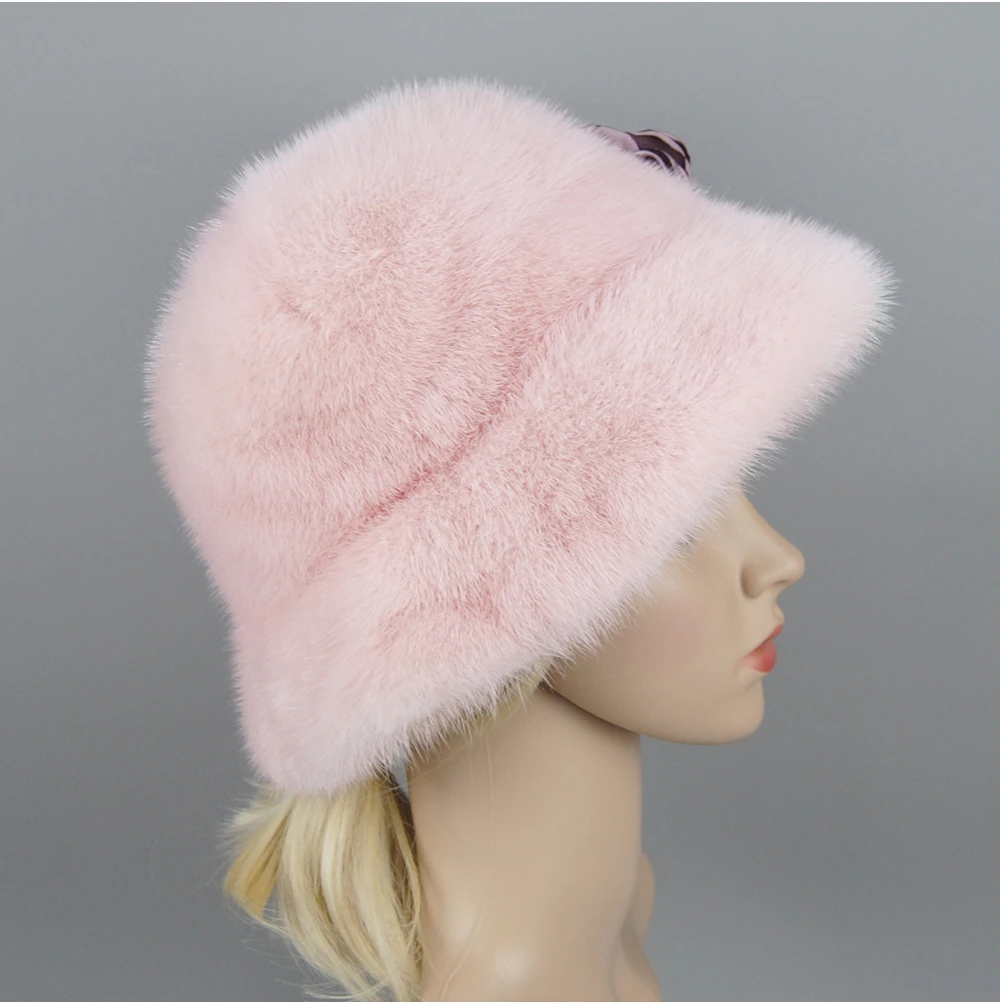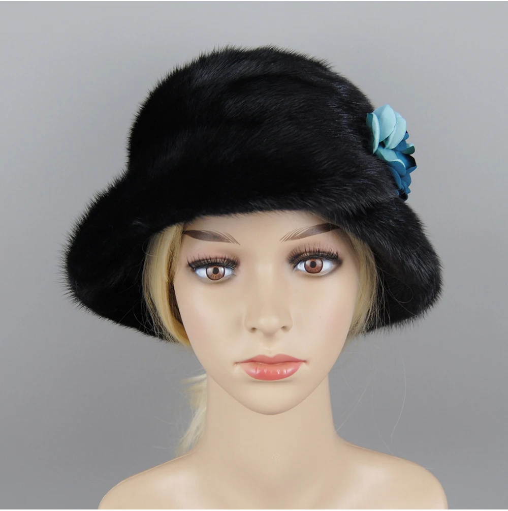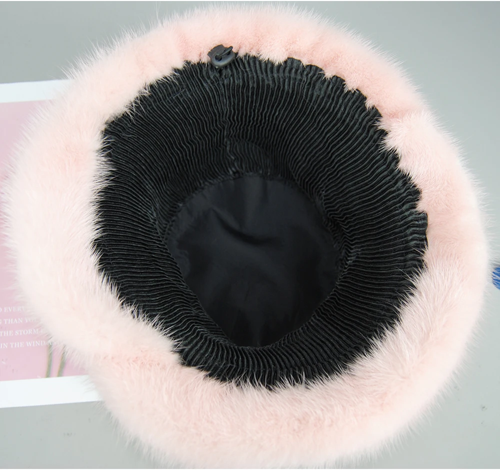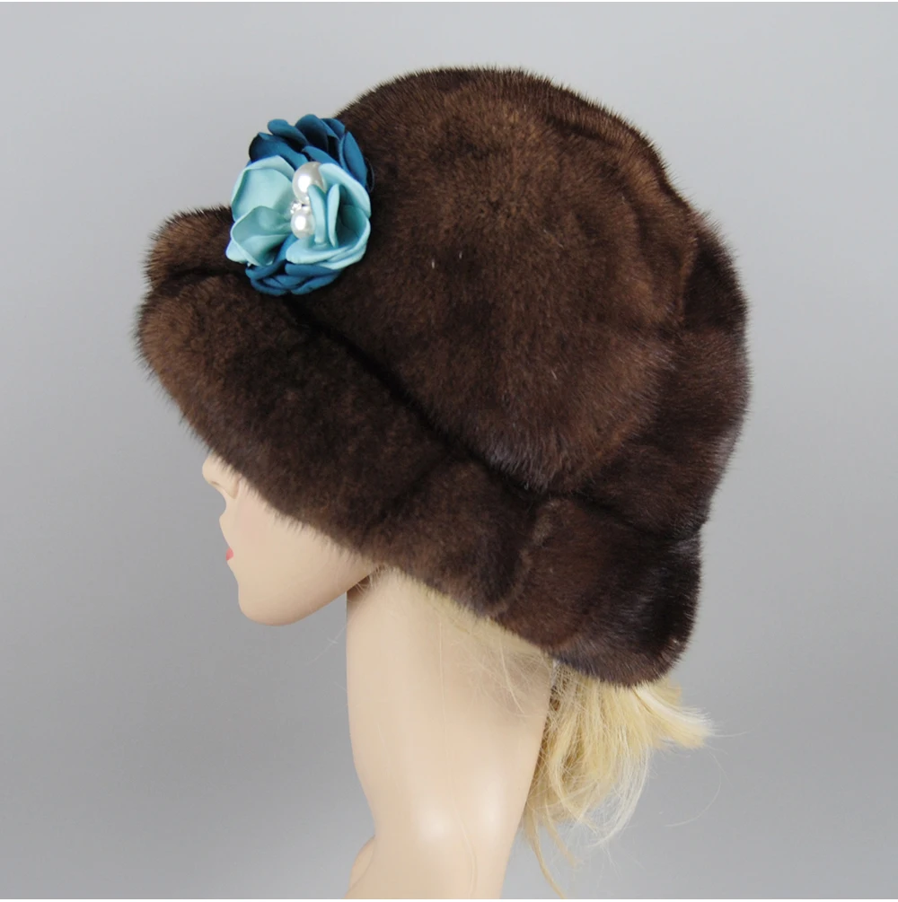قبعات نسائية شتوية دافئة لعام 2024 من فرو المنك الصلب مع زهور وقبعات من فرو المنك الطبيعي قبعات دلو من الفرو الحقيقي محبوكة ناعمة للفتيات الروسيات