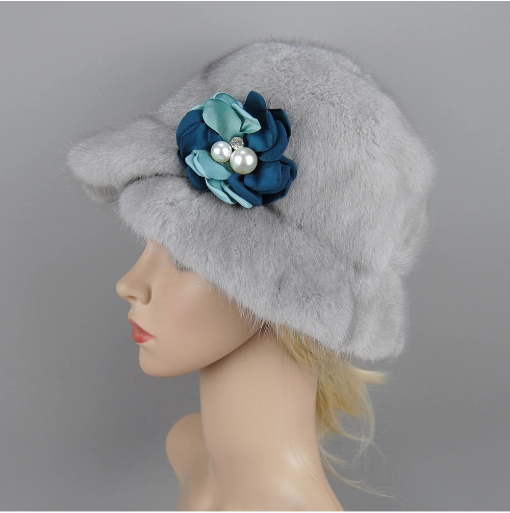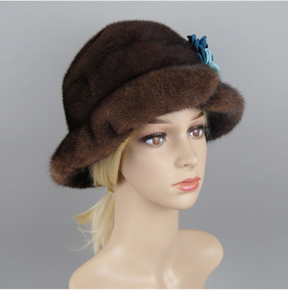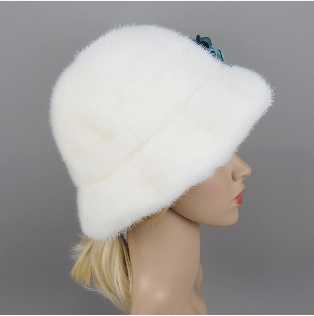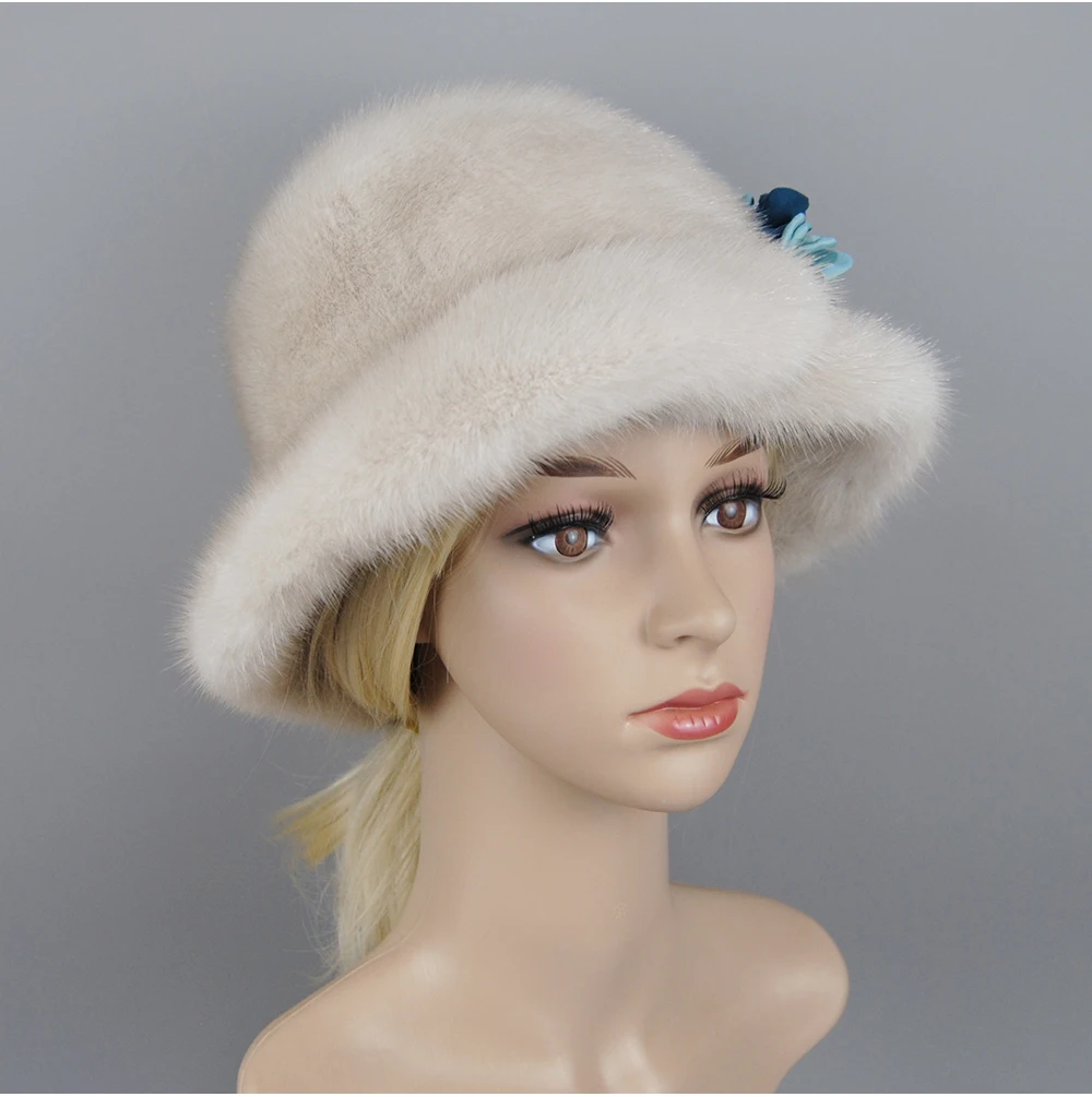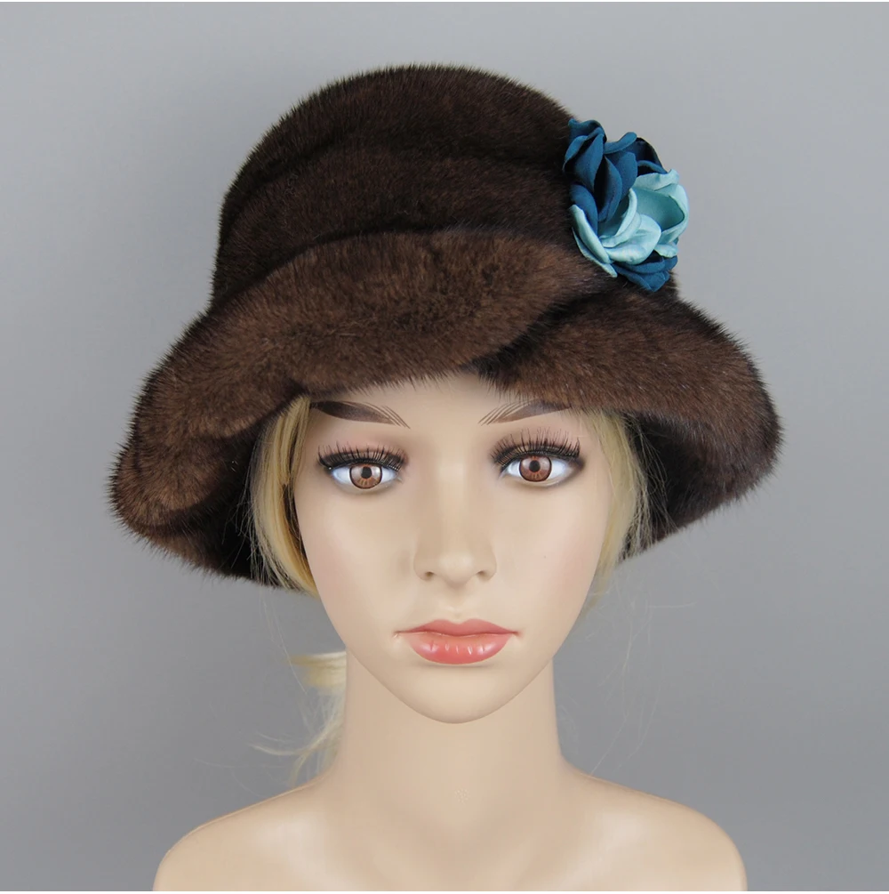 قبعات نسائية شتوية دافئة لعام 2024 من فرو المنك الصلب مع زهور وقبعات من فرو المنك الطبيعي قبعات دلو من الفرو الحقيقي محبوكة ناعمة للفتيات الروسيات