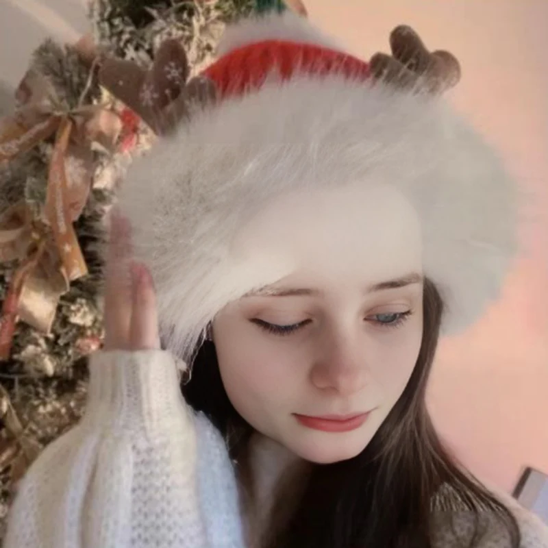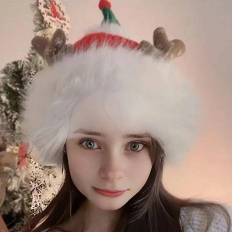قبعات عيد الميلاد للبالغين، قبعات شتوية دافئة مزينة بالفرو الصناعي، قبعات محبوكة من قرون الغزال الخارجية