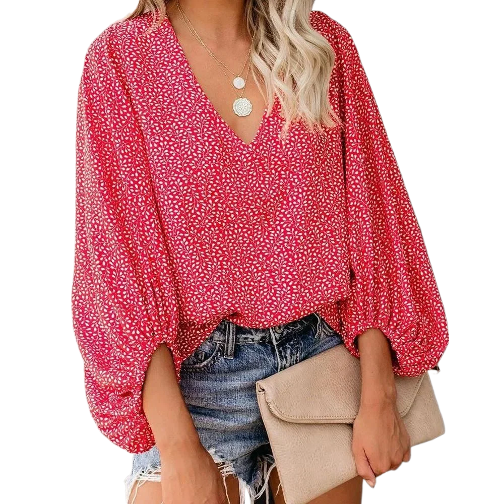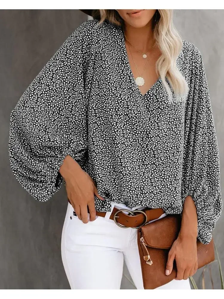 2025 ملابس نسائية جديدة للبيع الساخن الربيع والصيف قميص كاجوال مطبوع بأكمام فانوس ورقبة على شكل حرف V ملابس نسائية قمصان عصرية
