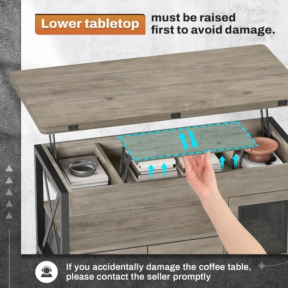 - 【What you get?】The lift top coffee table with 4 lifting methods also has a partitioned hidden storage compartment, an open storage shelf, 2 fabric drawers, a storage cabinet, and an LED light. Coffee tables for living room can be used when eating, working, studying, and playing games, quietly and easily lift the table top to facilitate a small room to make full use of the space. (Caution: Lower table top must be raised first to avoid damage. )