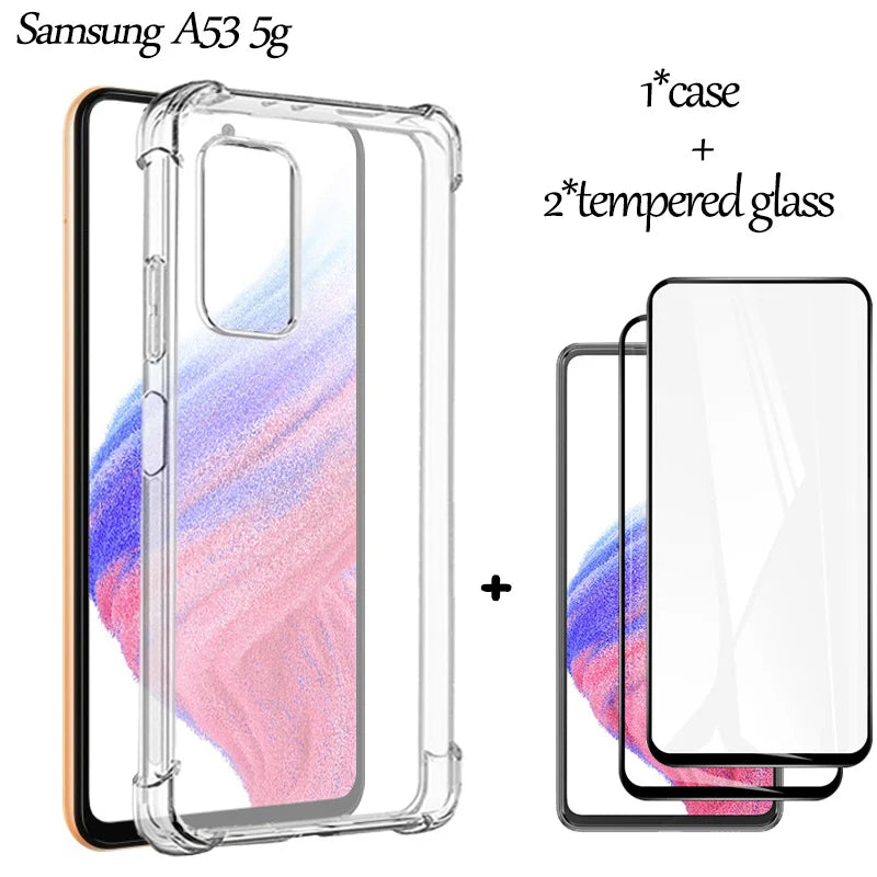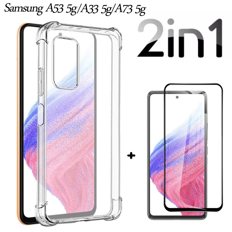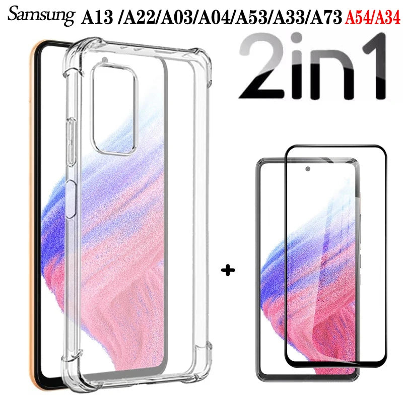 جراب لملحقات سامسونج a53 5g، جرابات هاتف سامسونج a54، جرابات سامسونج جالاكسي a13، جراب سيليكون ناعم مقاوم للصدمات وزجاج واقي كريستالي، سامسونج a54 a34 a 13 a04 a14 a03 a33 a73 5 g، جراب مرن شفاف من مادة TPU