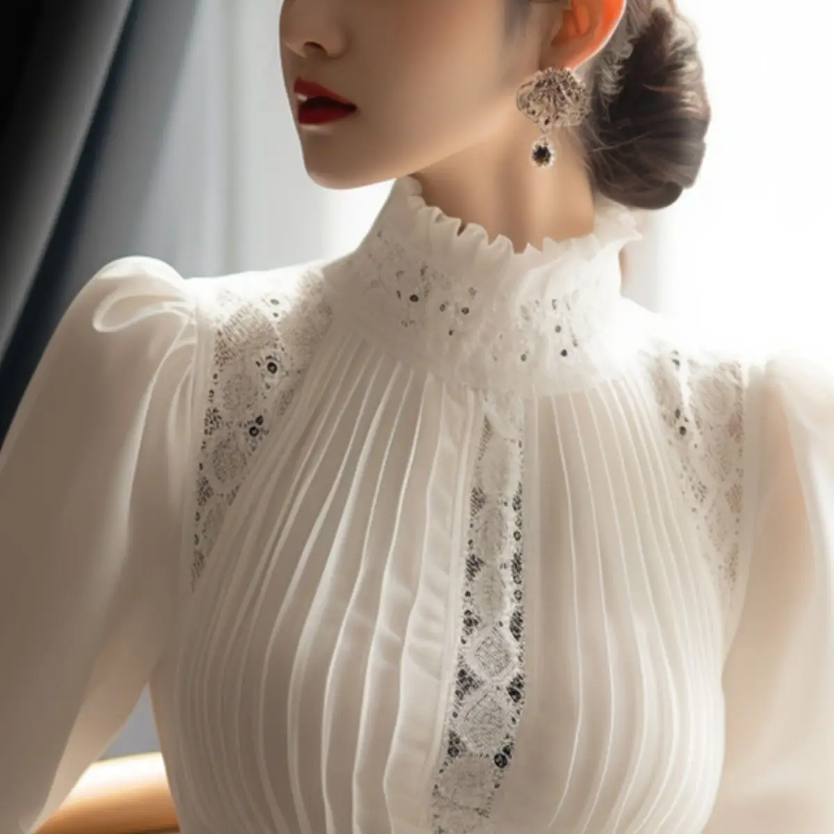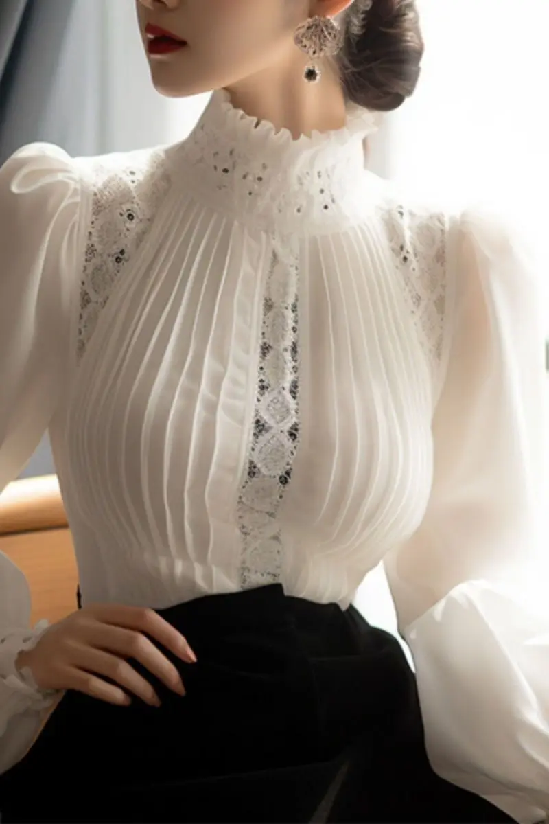 بلوزة بياقة عالية للنساء، بلوزات نسائية أنيقة، قميص أبيض كوري، ملابس نسائية نحيفة لربيع 2025