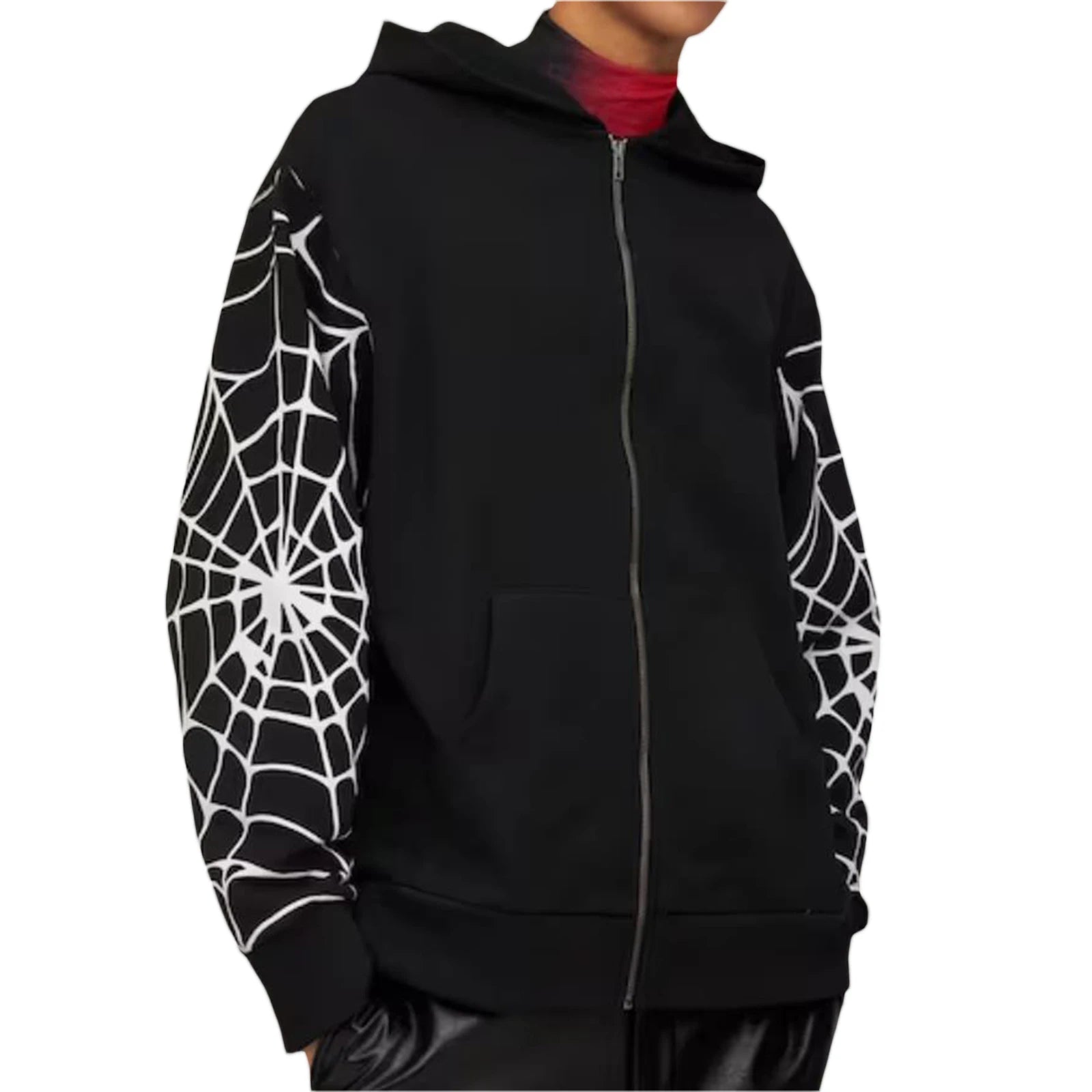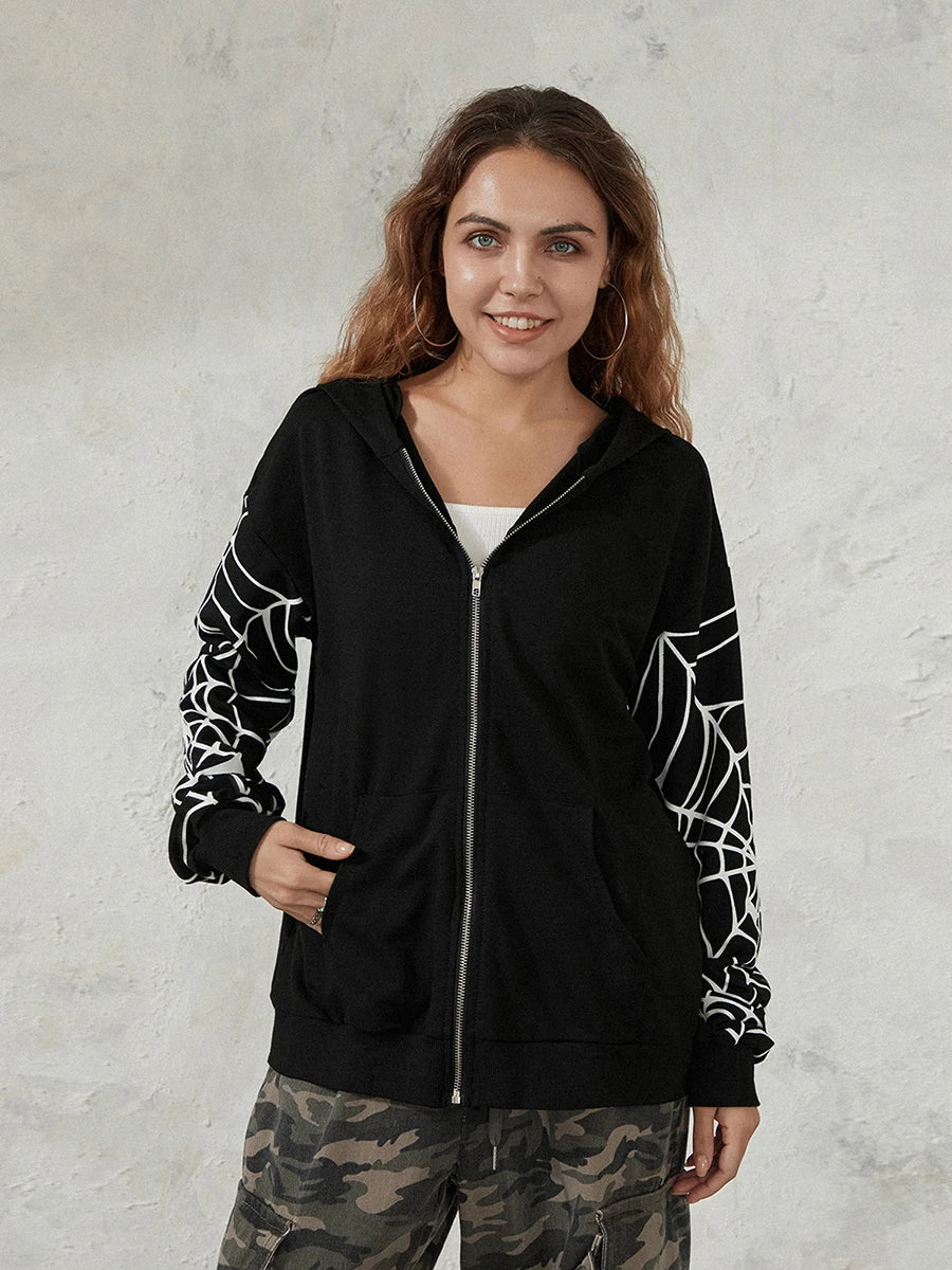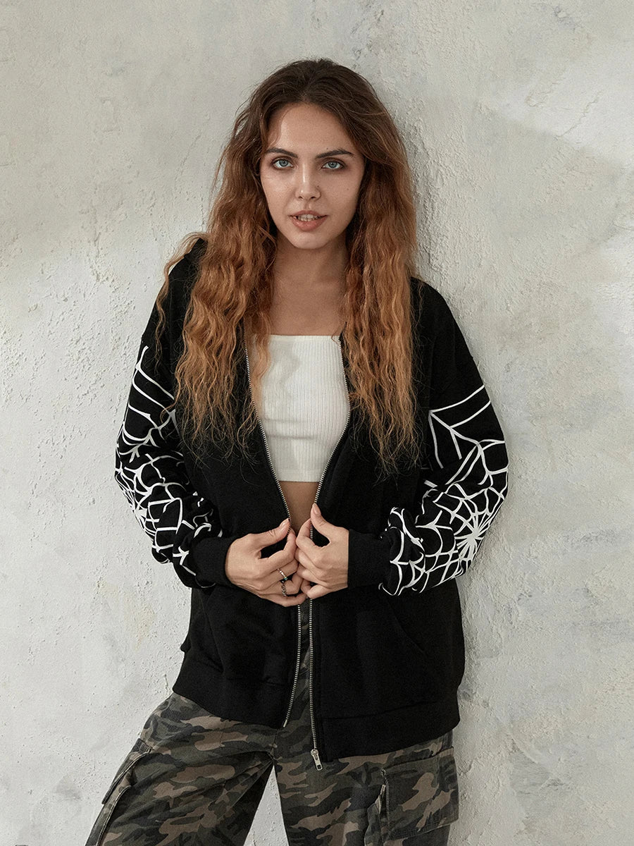Men Women Zip Up Hoodies Fashion Spider Web Print Long Sleeve Oversized Sweatshirts Streetwear Tops