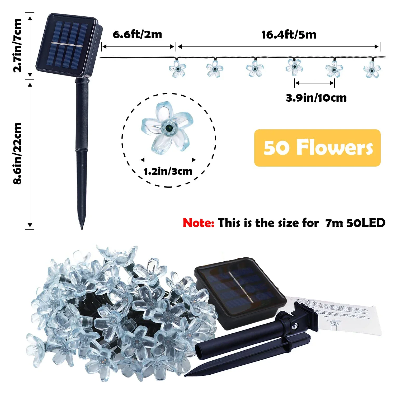 Upgraded Solar Flower String Lights-- Total length 23ft, IP65 waterproof, 50pcs low-heat-emission LED bulbs, durable and friendly to use, the LED string lights will not overheat after using it many hours, you can see some flowers shining in your garden any time, make your yard lively all the year.