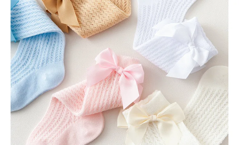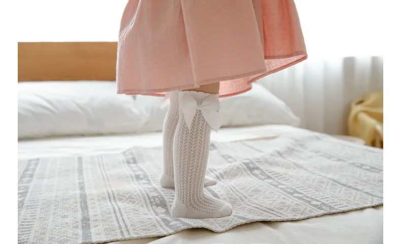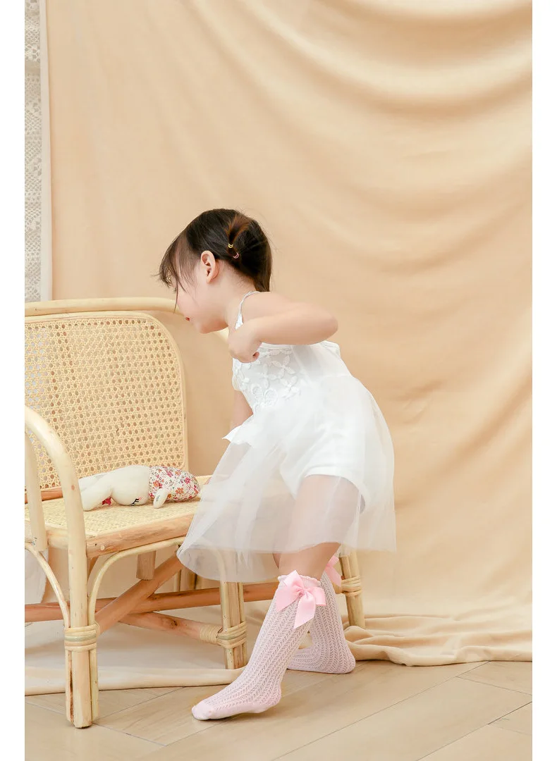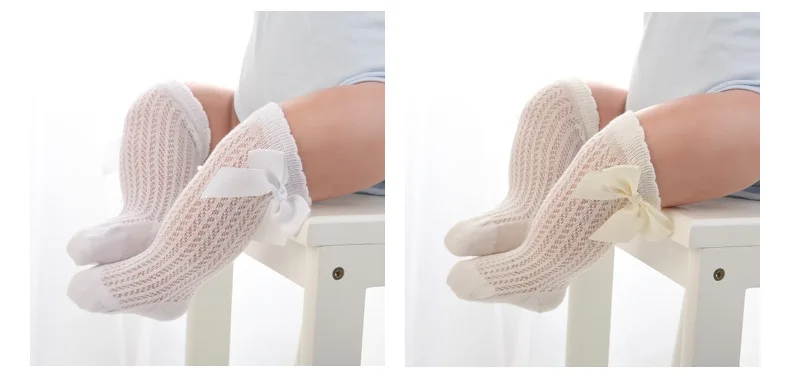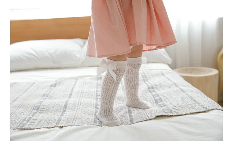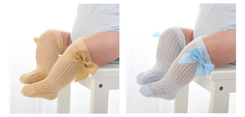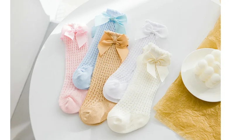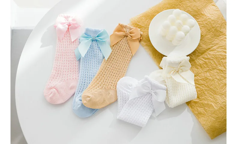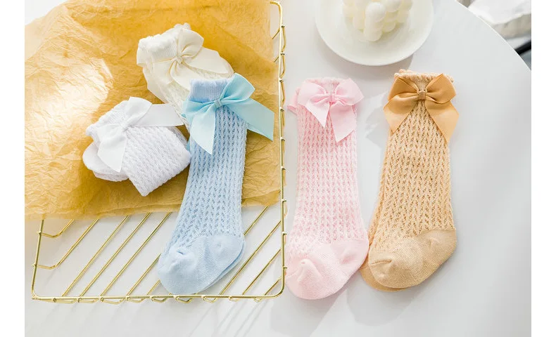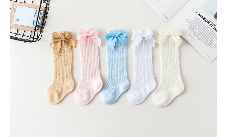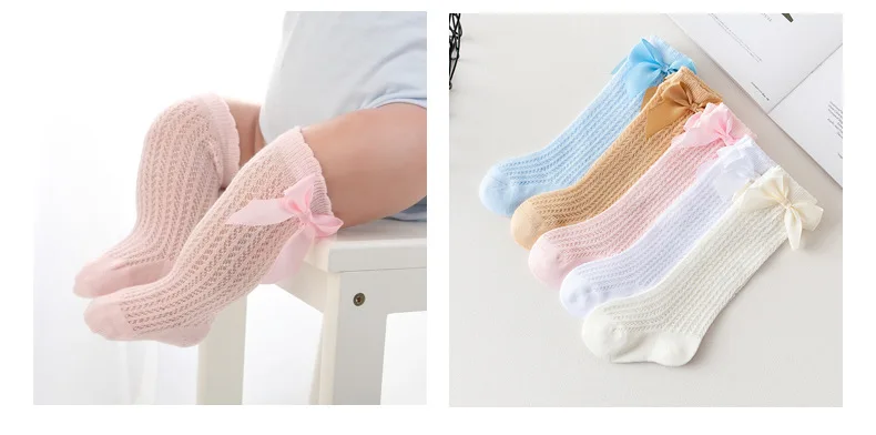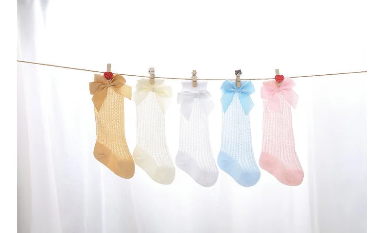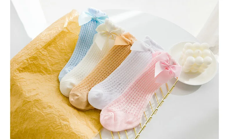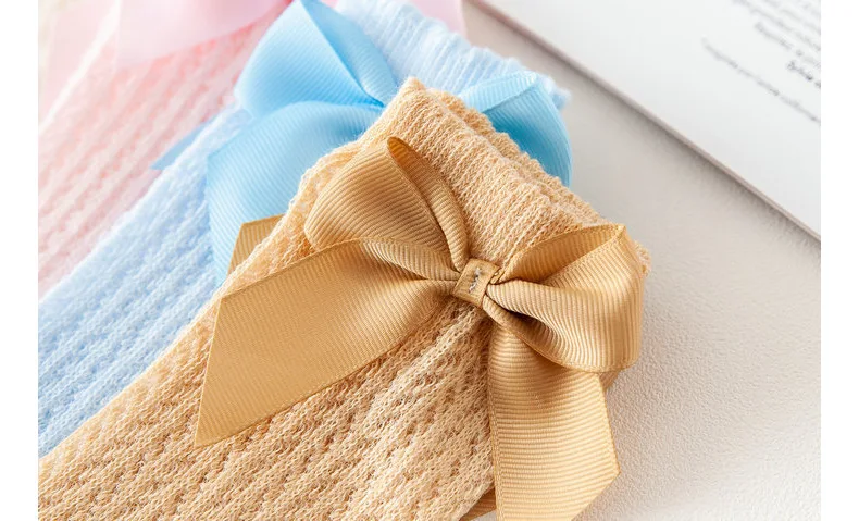جوارب صيفية للأطفال مصنوعة من شبكة رفيعة مقاومة للبعوض وجوارب طويلة حتى الركبة بفيونكة كبيرة وإكسسوارات ملابس فضفاضة للأطفال حديثي الولادة