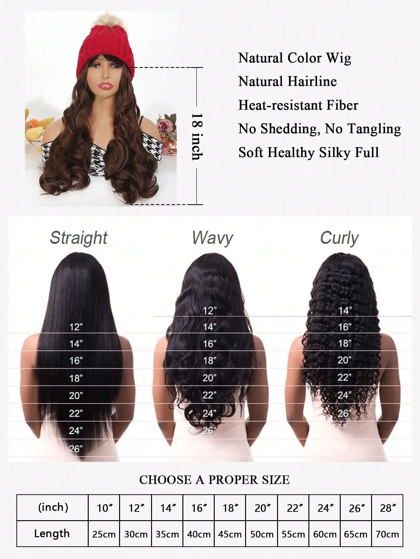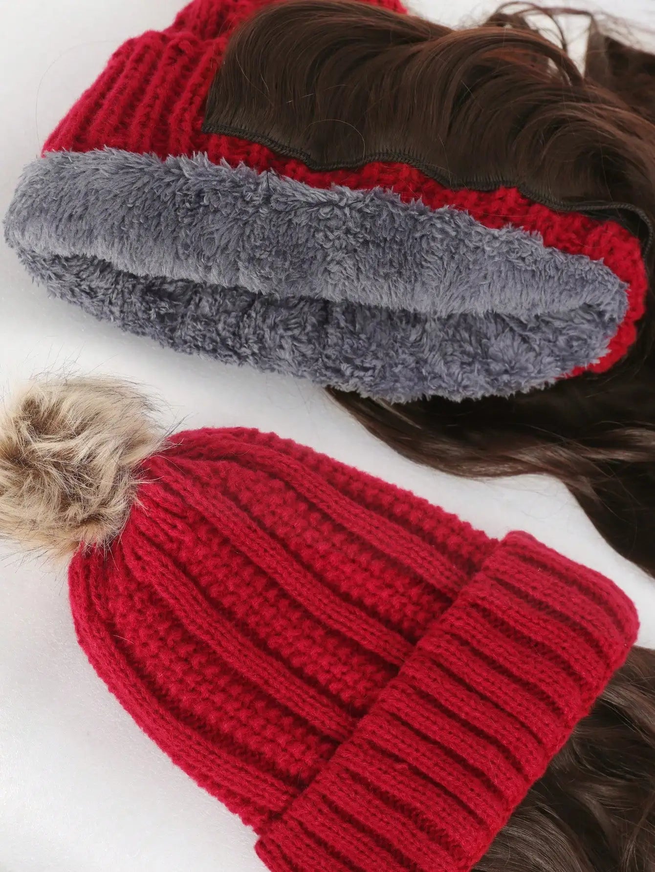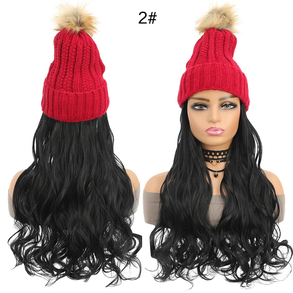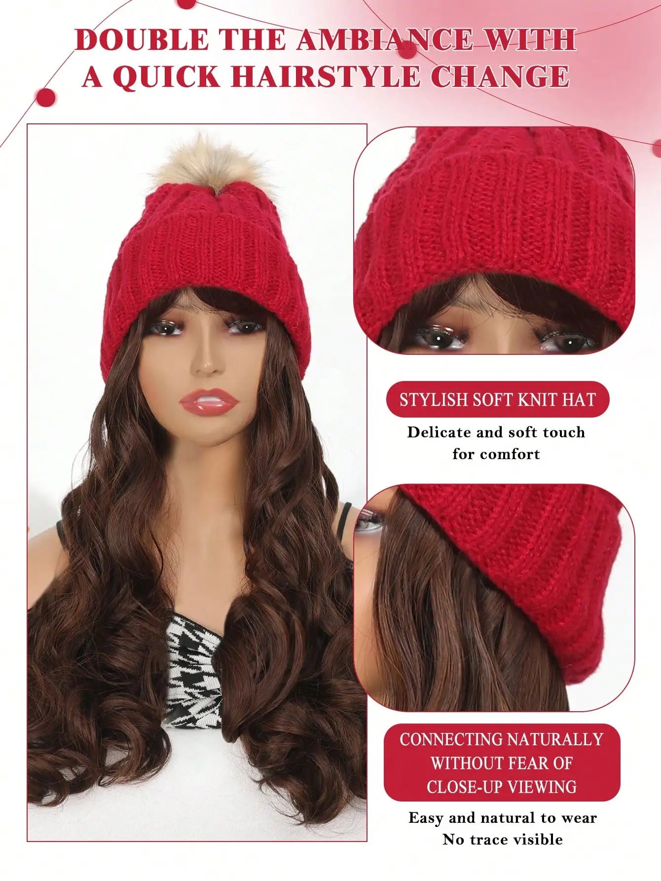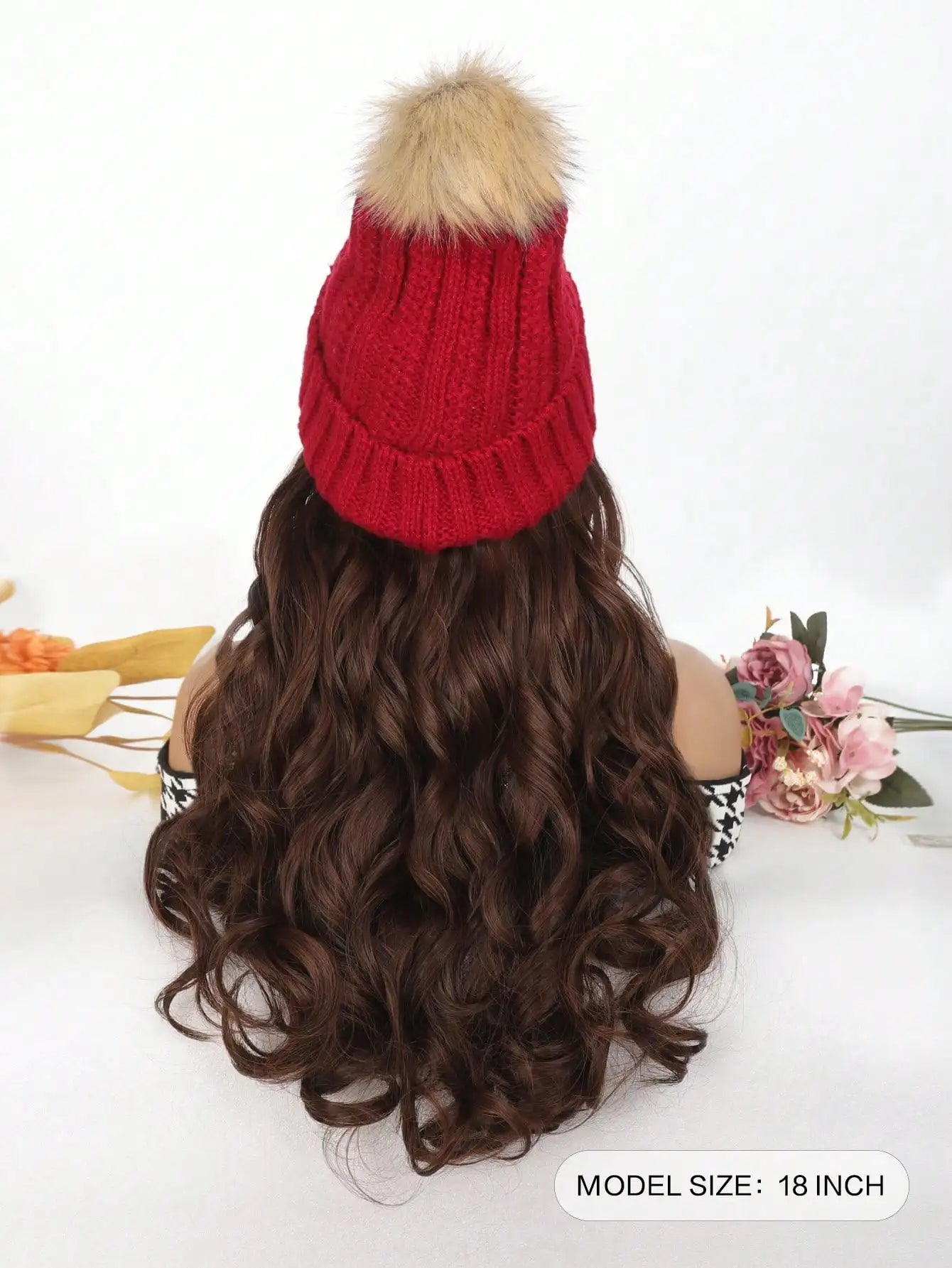 قبعة صناعية باروكة محبوكة حمراء دافئة مع كرة من الفرو مع وصلات شعر مموجة بطول 18 بوصة للنساء والفتيات
