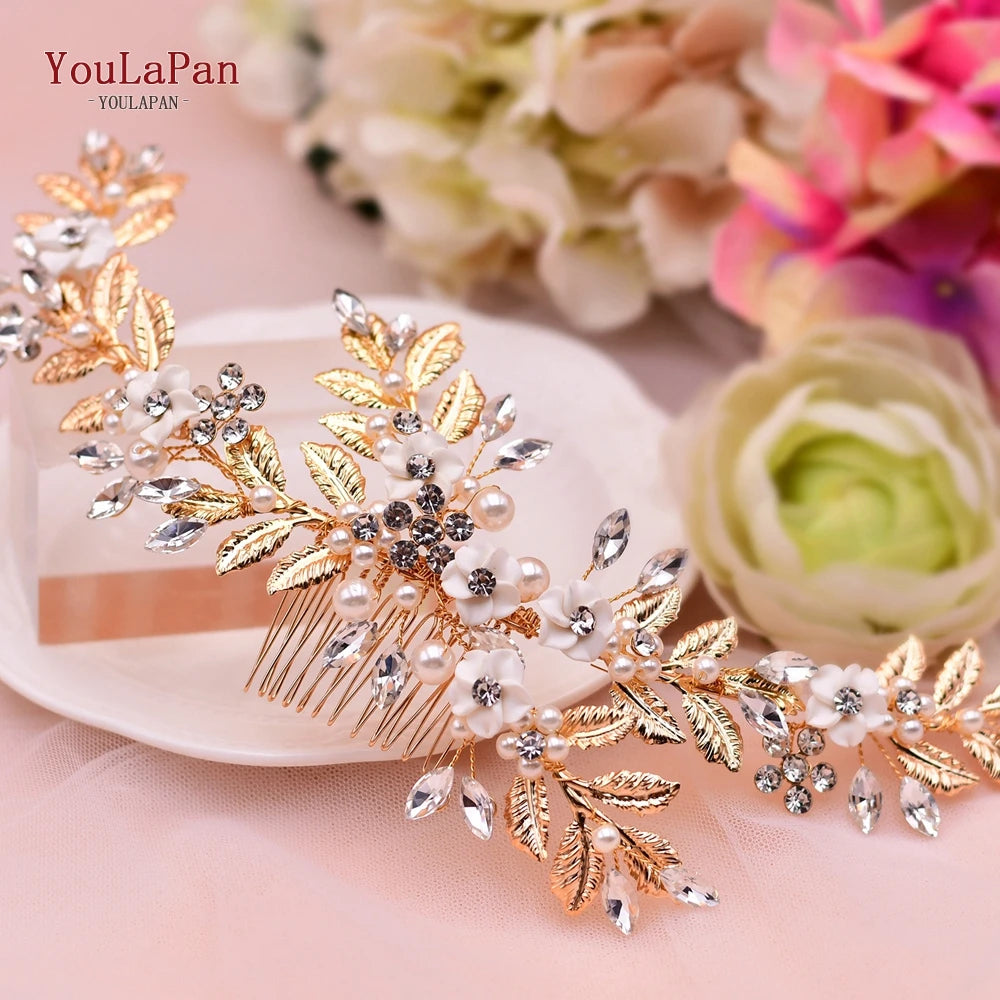 YouLaPan Gold Floral Wedding Hair Comb Bridal Crystal Pearls Headpiece Hair Accessories Bride Jewelry Women Hair Clips HP368