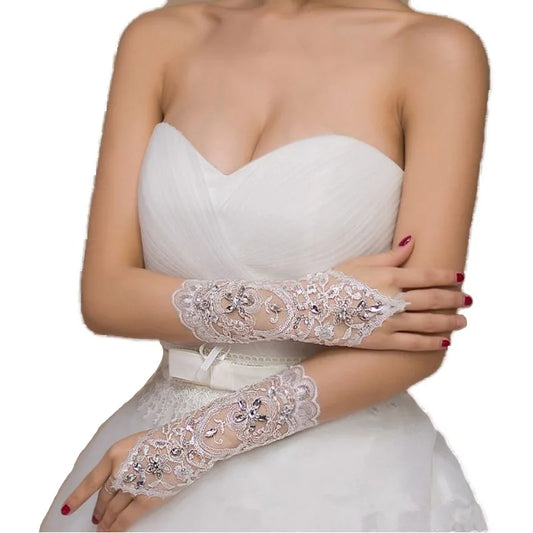 Lace Fingerless Elbow Length Bridal Gloves with Rhinestone for Women Paragraph White Wedding Accessories