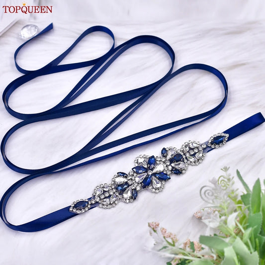 TOPQUEEN Blue Diamond Bridal Ribbon Belt Banquet Evening Dress Jewelry Sash Wedding Accessories Women Waist Decoration S166-ML
