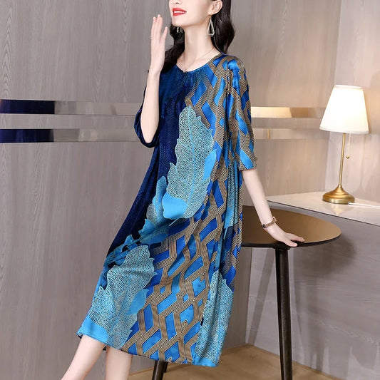 2024 Blue Print Natural Silk Midi Dress Summer New Elegant Loose Waist Plus Size Dress Women Korean Vintage Casaul Party Dress