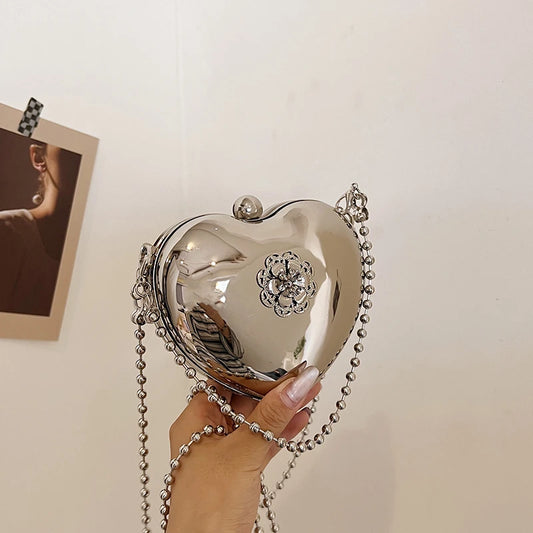 2025 New Fashion Mini Evening Party Bag Metal Frame Heart Shape Women Cross Body Bags Silver Gold Color Micro Chain Shoulder Bag
