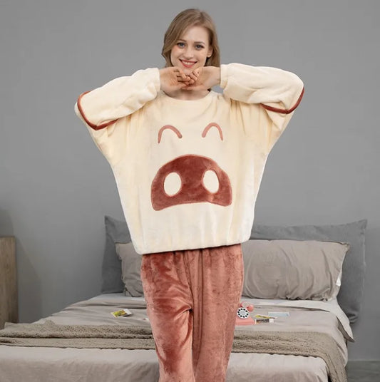 2 Piece Set Flannel Couple Cartoon Style Loose and Thick to Keep Warm Sleepwear Women Pajamas