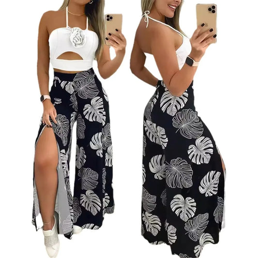 Women's 2pcs Clothing Set Halter Top Sleeveless Cami Tanks Slit Floral Leaves Printed Skirt Suit Summer
