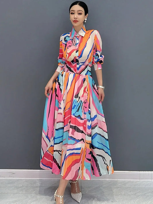 SHENGPALAE 2024 Summer New Women 2 Piece Set Printed Mid Sleeve Shirt And Large Swing Skirt Loose Fashion Female Clothes 5C7427