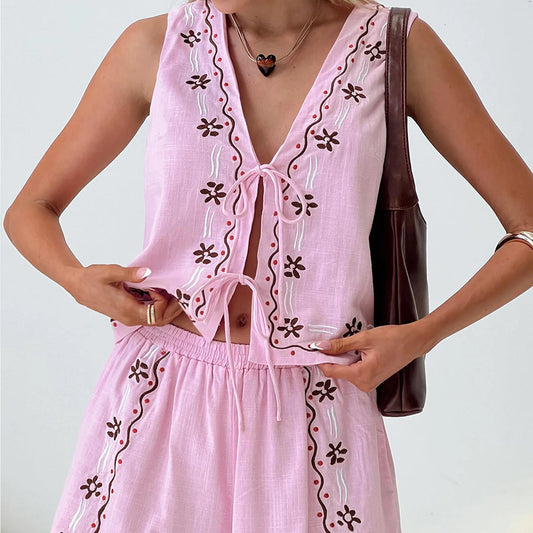 hirigin Women Summer Shorts Outfits Embroidery Tie-Up Front V-Neck Sleeveless Tank Tops Elastic Waist Shorts 2Pieces Clothes Set