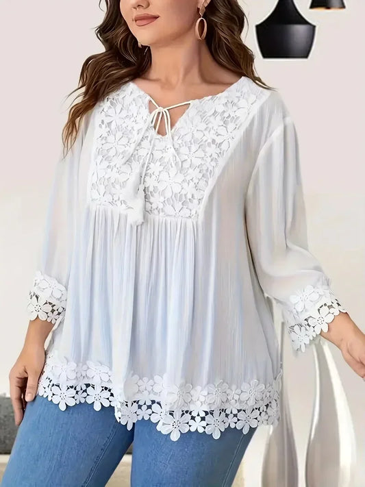 Plus Size 1XL-5XL Women's Casual Solid Color Shirt Ladies Fashion Lace Trim Spring Summer Casual Blouse Top