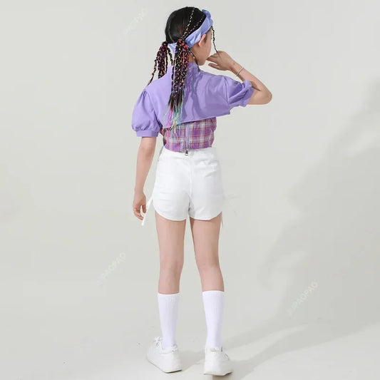 Girls Summer Jazz Dance Costume Plaid Tops Shorts K-pop Clothing Hip Hop Dance Outfit for Children Cheerleading Clothes Kids AB