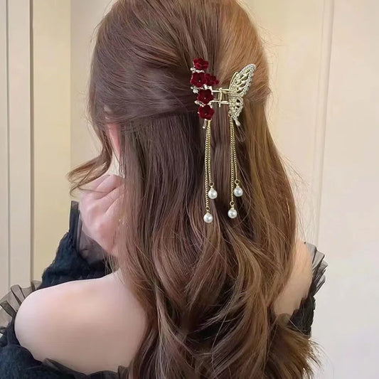 Exquisite Rhinestone Butterfly Fringe Hair Claw Clips Korean New Ponytail Braid Pearl Hairpin Girl Crab Metal Headdress Gift