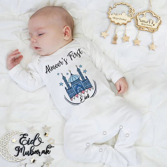 Personalisierter Eid Baby Strampler mit Namen Langarm Schlafanzug Eid Ramadan Neugeborenen Outfit Islamische muslimische Urlaubskleidung