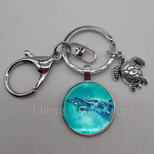 Marine life jewelry turtle dolphin shell keychain key ring glass convex round keychain charm turtle pendant Christmas gift