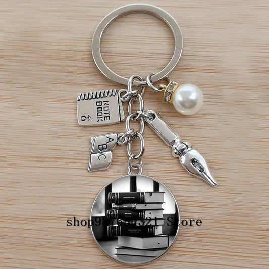 Classic Library Books Keychain Vintage Old Books Key Chain Librarians Key Ring Gift for Nerd Bookworm Writer Teacher
