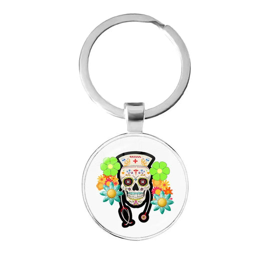 Fashion Colorful Sugar Skull Keychain Mexico Folk Art Patterns Glass Pendant Key Chain Jewelry Holiday Gift