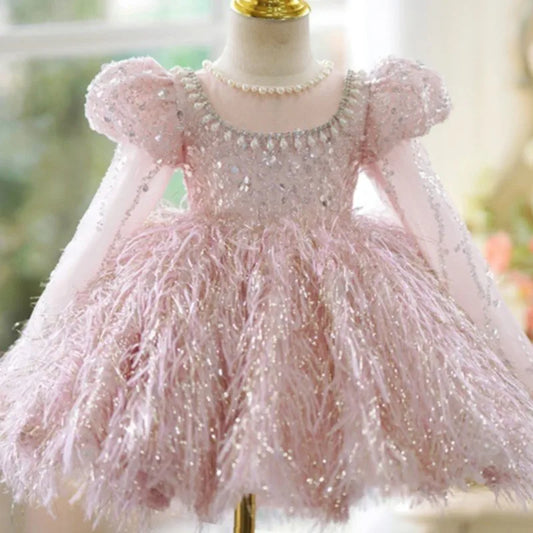 Fashion kids Girl Sequins Feather Dress Puffy Sleeve Pearl Vestido 2-14Y