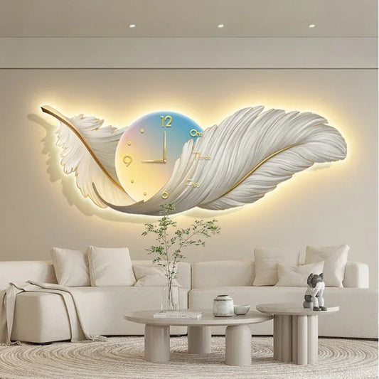 Modern Luxury Wall Clock LED Feather 3d Decorative Painting Large Wall Clock with Light Sofa Background Living Room Decoration