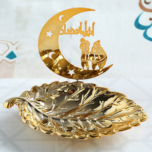 Gold Metal Ramadan Food Tray Eid Mubarak Dessert Fruit Plate Ramadan Decoration Islamic Muslim Festival Decor Gift Jewelry Plate
