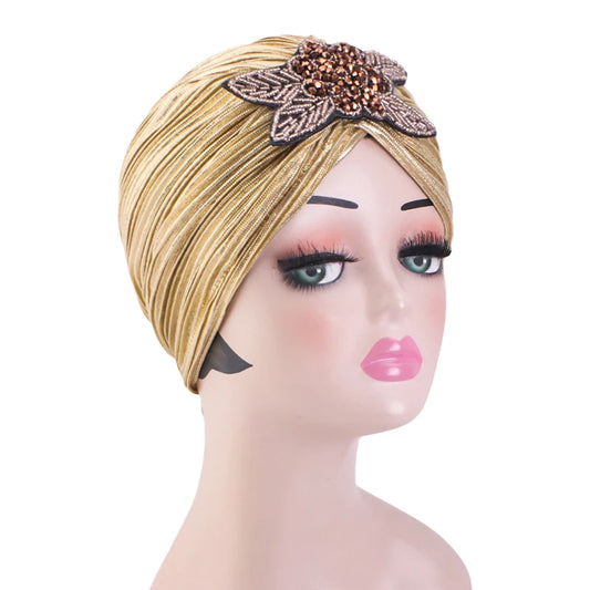 New Rhinestone Flower Turban For Women Elegant Pleated Skull Cap Muslim Hijab Hat Headwraps Elastic Ramadan Beanies Chemo Cap