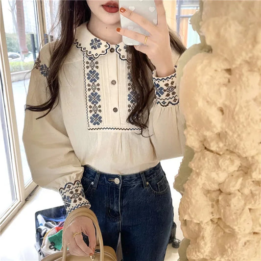Korobov Vintage Autumn Shirts Embroidery Lapel Long-sleeved Blouses Female Camisas Puffed Sleeve Doll Collar Top Korean Fashion