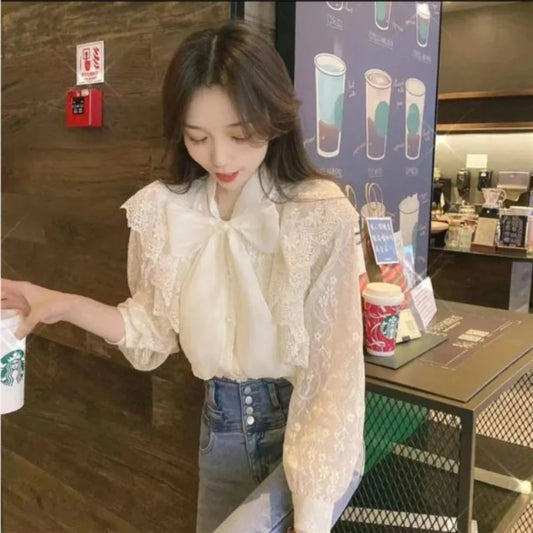 Blouses Women Scarf Collar Long Sleeve Elegant Chiffon Tops Bow Lace Fairy