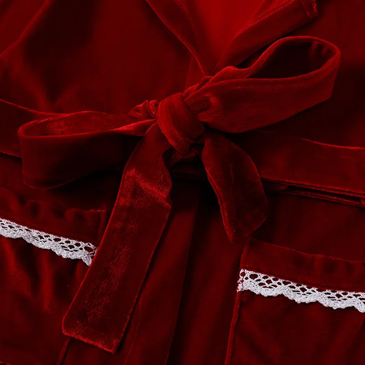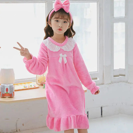 Autumn Winter Girls Flannel Nightdress Children Long-sleeve Nightdress Round Neck Bowknot Decoration Princess Style Pajamas