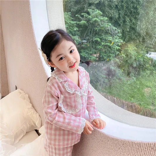 Children Pajamas 2024 Spring New Korean Children Clothing Girl Sweet Checkered Pajama Set Long sleeved Pants Home Fury