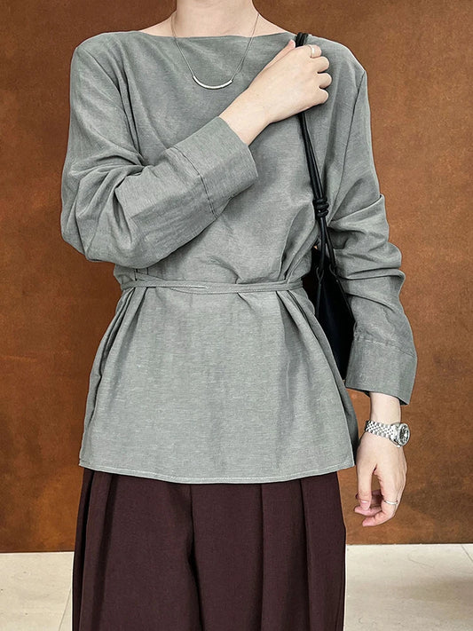FANAN Women's Shirts Round Neck Lace-up Gathered Waist Long Sleeve Fit Blouses Female Tops Fashion Clothes 2025 Spring New