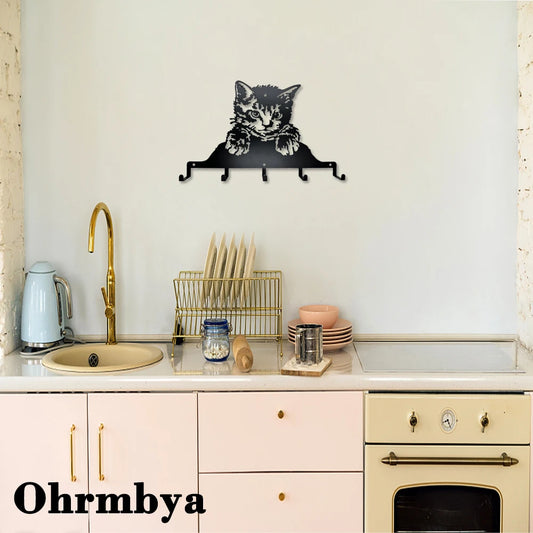 Cute Kawaii Metal Key Holder Black Key Hooks Wall Mount Hanger Decor Hanging Organizer Rack Decorative with 5 Hooks Cat Pattern