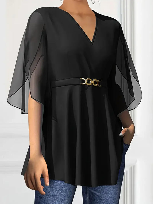 Plus Size Short Sleeve Chiffon Blouse Women's V-neck Waist Cinched Elegant Casual Blouse Top Fashion Clothing Summer 2025