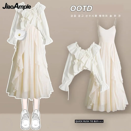 Women's Dress Set 2024 Spring Summer Fashion Bubble Sleeve Shirt+Suspended Skirt Two Piece Korean Elegant New Matching Set